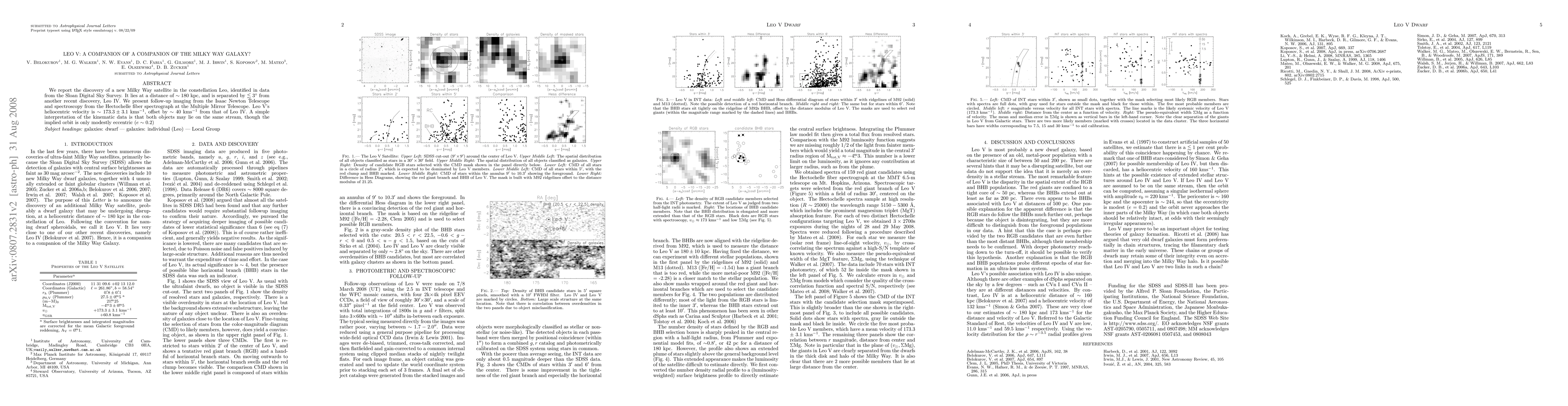 A new Milky Way dwarf spheroidal galaxy, Leo V, has been discovered in the constellation of Leo, 180 kpc from Earth, with a heliocentric velocity of 173.4 km/s and an eccentric orbit.