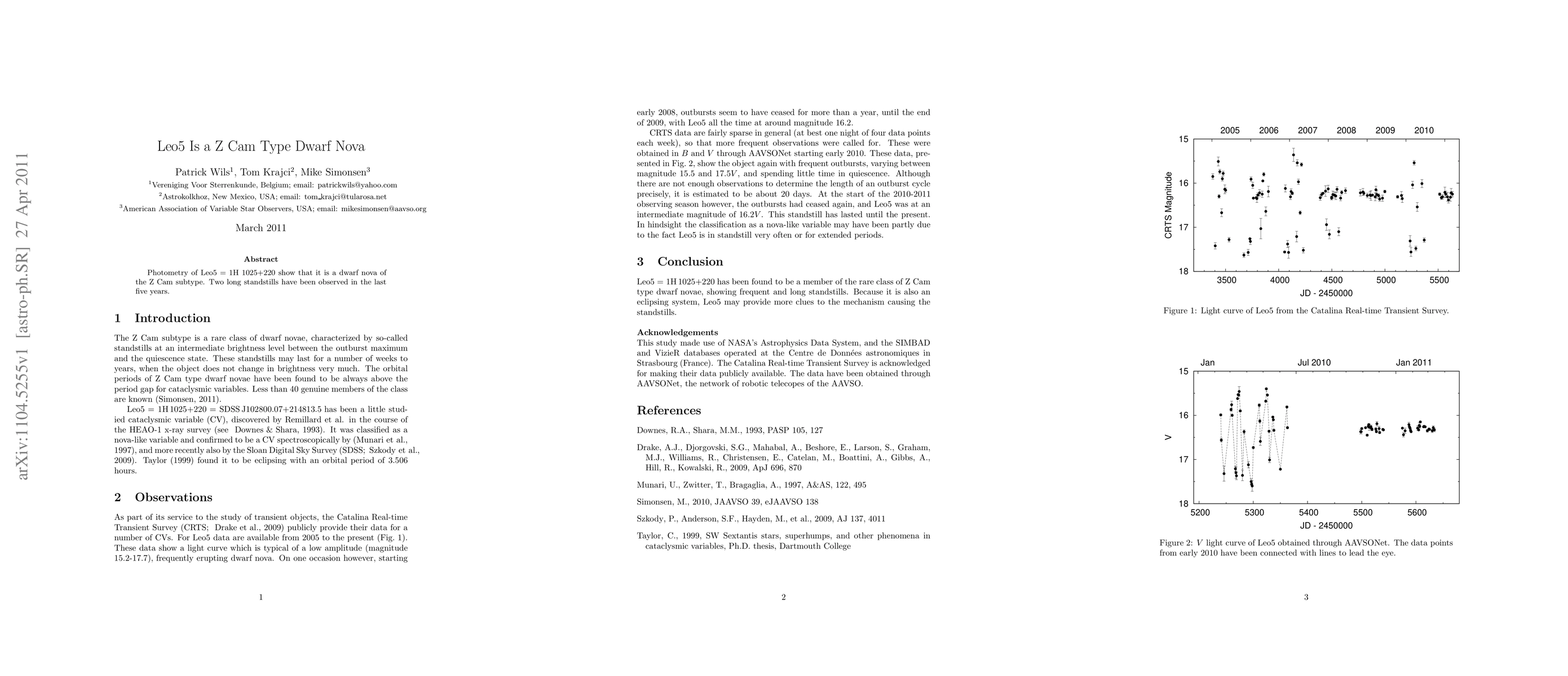 Summary: Photometric observations of Leo5 (1H 1025+220) reveal it as a Z Cam type dwarf nova, characterized by two long standstills in the past five years, confirming its classification within the Z Cam subtype.