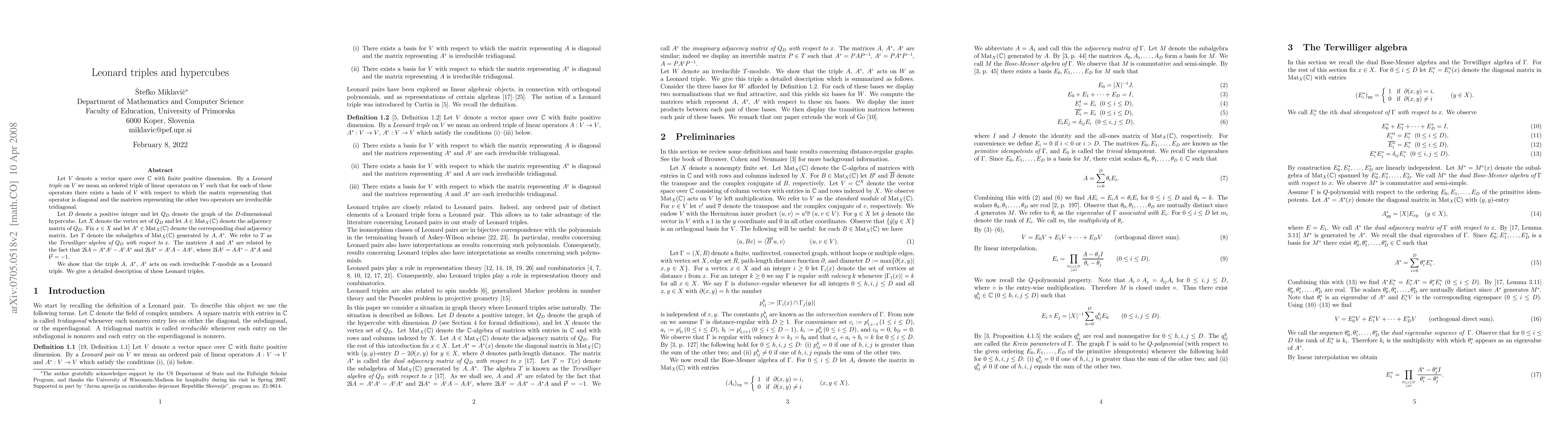 This paper explores Leonard triples on a vector space and their connection to the Terwilliger algebra of the $D$-dimensional hypercube graph. It demonstrates that the adjacency matrix $A$, its dual $A^*$, and the matrix $A^e$ form a Leonard triple acting on the Terwilliger algebra, providing a detailed description of these structures.