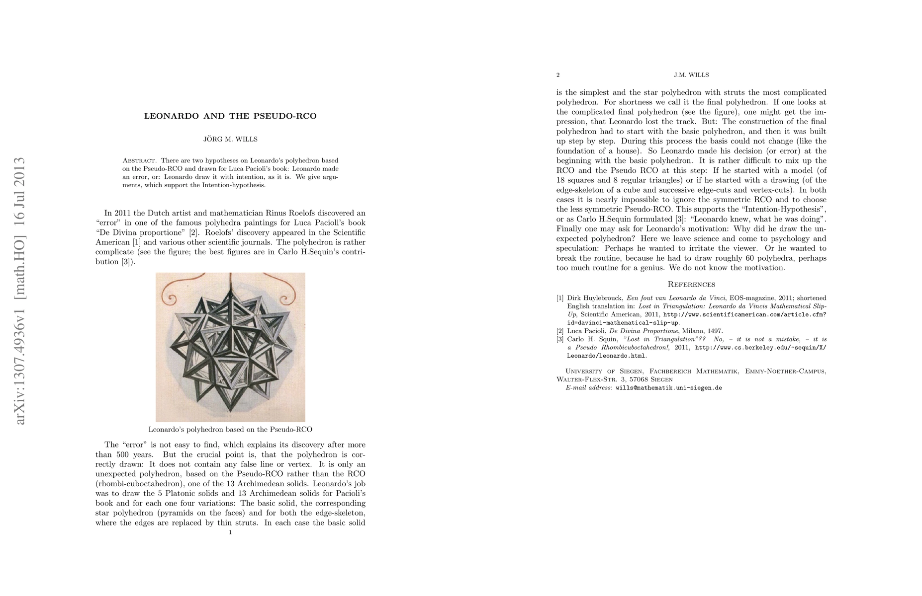 There are two hypotheses on Leonardo's polyhedron based on the Pseudo-RCO and drawn for Luca Pacioli's book: Leonardo made an error, or: Leonardo draw it with intention, as it is. We give arguments, which support the Intention-hypothesis.