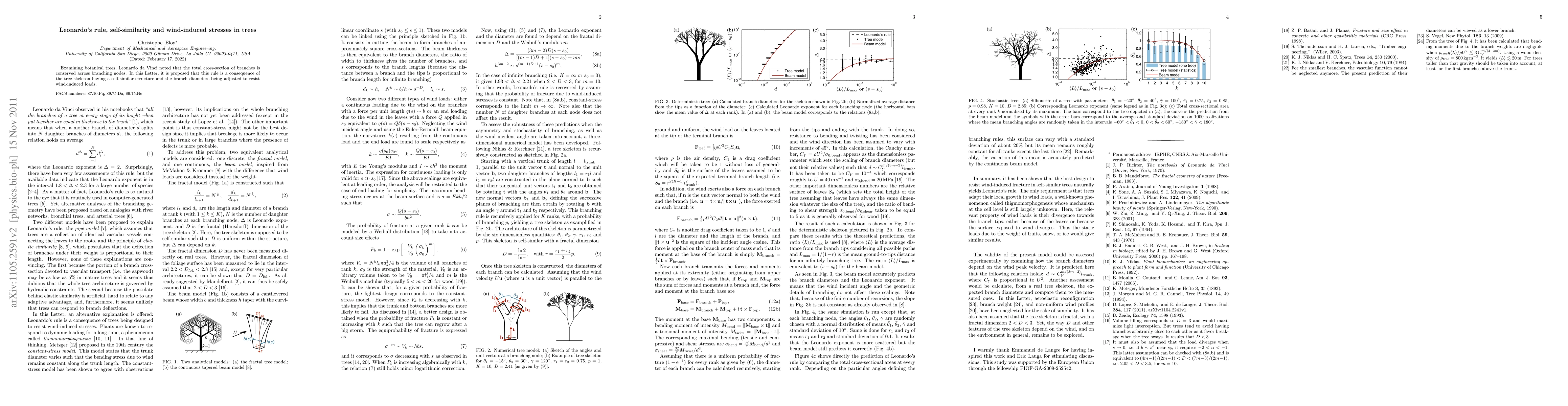 Summary: Leonardo da Vinci's rule on the conservation of total cross-section in tree branches is explained by the self-similar structure of tree skeletons, with branch diameters adjusted to resist wind-induced stresses. This adaptation optimizes structural integrity against environmental forces.