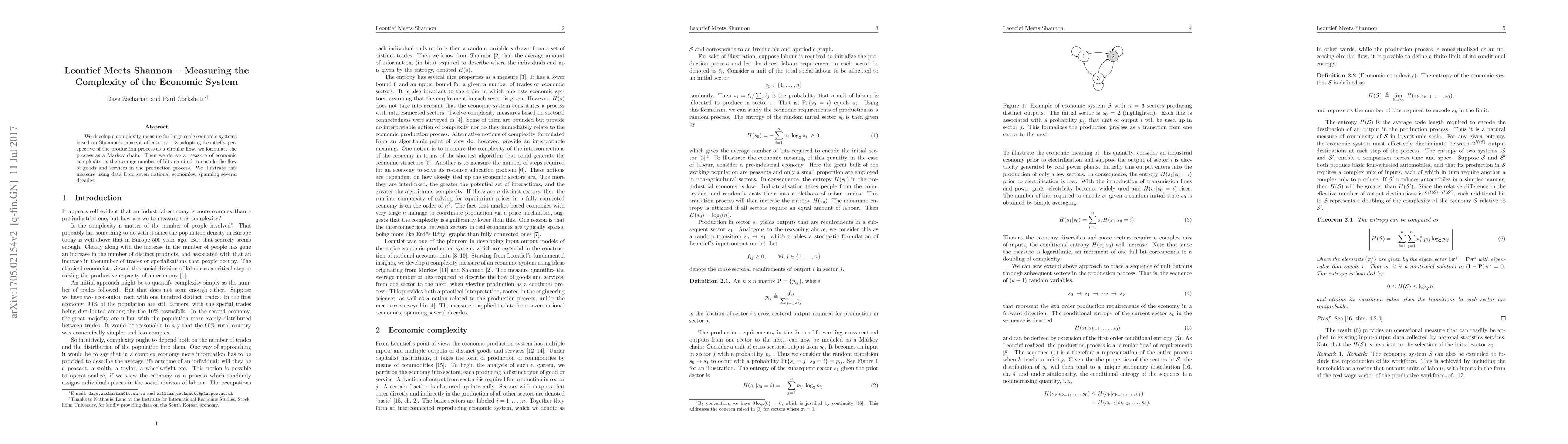 We develop a complexity measure for large-scale economic systems based on Shannon's concept of entropy. By adopting Leontief's perspective of the production process as a circular flow, we formulate the process as a Markov chain. Then we derive a measure of economic complexity as the average number of bits required to encode the flow of goods and services in the production process. We illustrate this measure using data from seven national economies, spanning several decades.