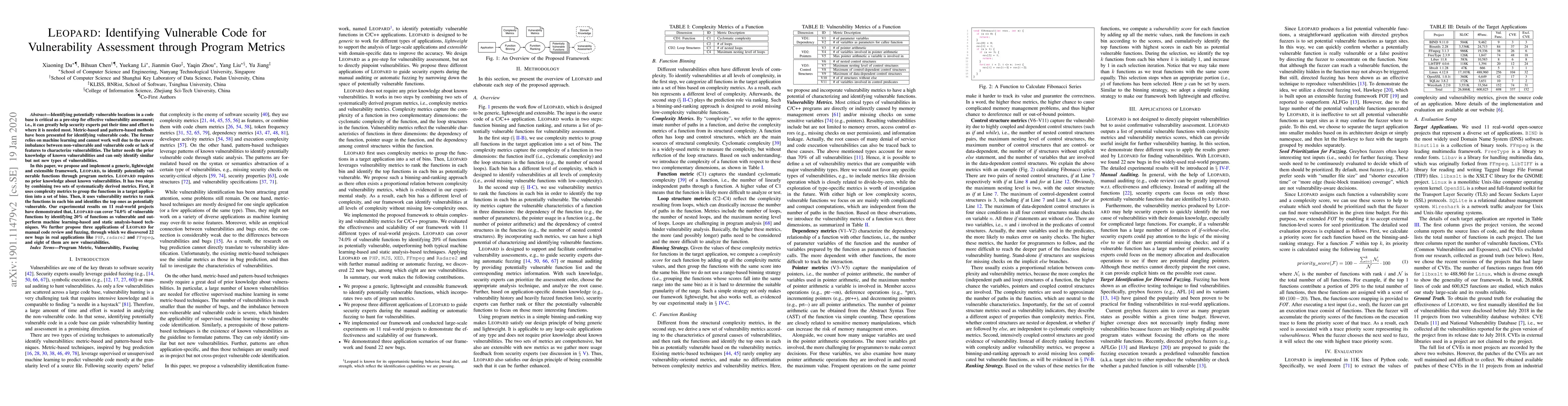 LEOPARD is a framework that identifies potentially vulnerable functions in code bases using program metrics without requiring prior knowledge of known vulnerabilities. It outperforms existing machine learning and static analysis techniques, discovering 22 new bugs, including eight new vulnerabilities, in real-world applications.