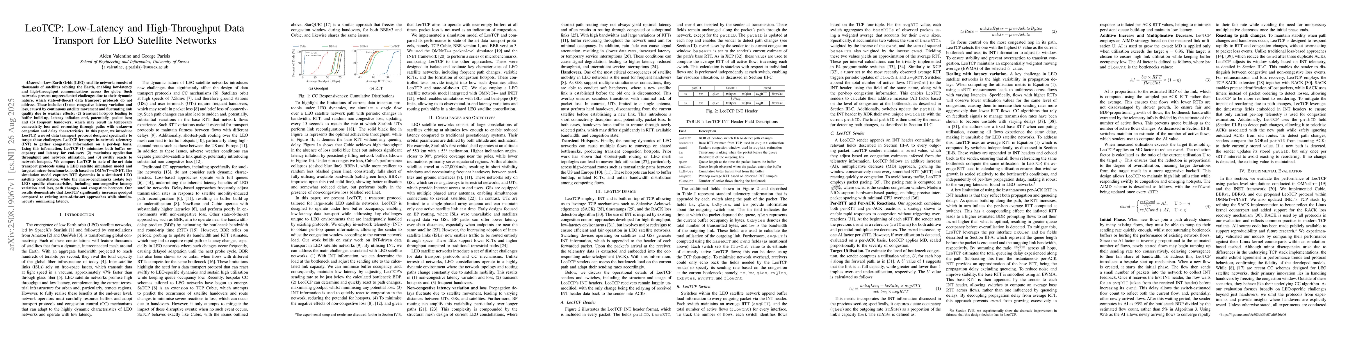Low-Earth Orbit (LEO) satellite networks consist of thousands of satellites orbiting the Earth, enabling low-latency and high-throughput communications across the globe. Such networks present unprecedented challenges due to their dynamic nature, which state-of-the-art data transport protocols do not address. These challenges include: (1) non-congestive latency variation and loss, caused by continuous satellite movement and fluctuating link quality due to weather effects; (2) transient hotspots leading to buffer build-up, latency inflation, and potential packet loss; and (3) frequent handovers, which may result in temporary connectivity loss and re-routing through paths with unknown congestion and delay characteristics. In this paper, we introduce LeoTCP, a novel data transport protocol designed specifically to address these challenges. LeoTCP leverages in-network telemetry (INT) to gather congestion information on a per-hop basis. Using this information, LeoTCP (1) minimises both buffer occupancy and latency for end users, (2) maximises application throughput and network utilisation, and (3) swiftly reacts to network hotspots. We compare LeoTCP to state-of-the-art data transport protocols using a LEO satellite simulation model and targeted micro-benchmarks, both based on OMNeT++/INET. The simulation model captures RTT dynamics in a simulated LEO satellite constellation, while the micro-benchmarks isolate key LEO-specific characteristics, including non-congestive latency variation and loss, path changes, and congestion hotspots. Our results demonstrate that LeoTCP significantly increases goodput compared to existing state-of-the-art approaches, while simultaneously minimising latency.