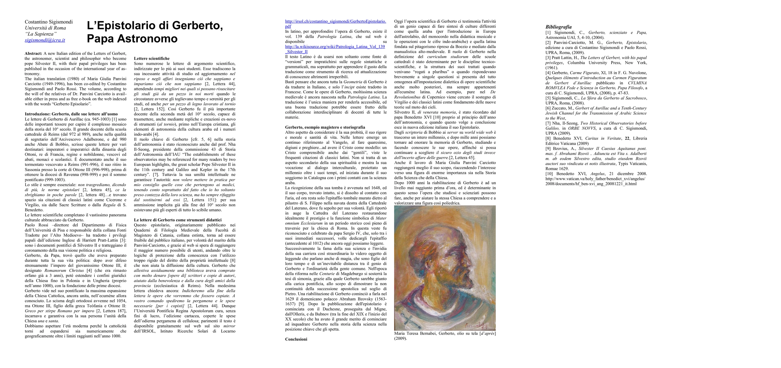 A new Italian edition of the Letters of Gerbert, the astronomer, scientist and philosopher who become pope Silvester II, with their papal privileges has been published in the occasion of the international year of astronomy. The italian translation (1980) of Maria Giulia Panvini Carciotto (1949-1996), has been co-edited by Costantino Sigismondi and Paolo Rossi. The volume, according to the will of the relatives of Dr. Panvini Carciotto is available either in press and as free e-book on the web indexed with the words "Gerberto Episolario".