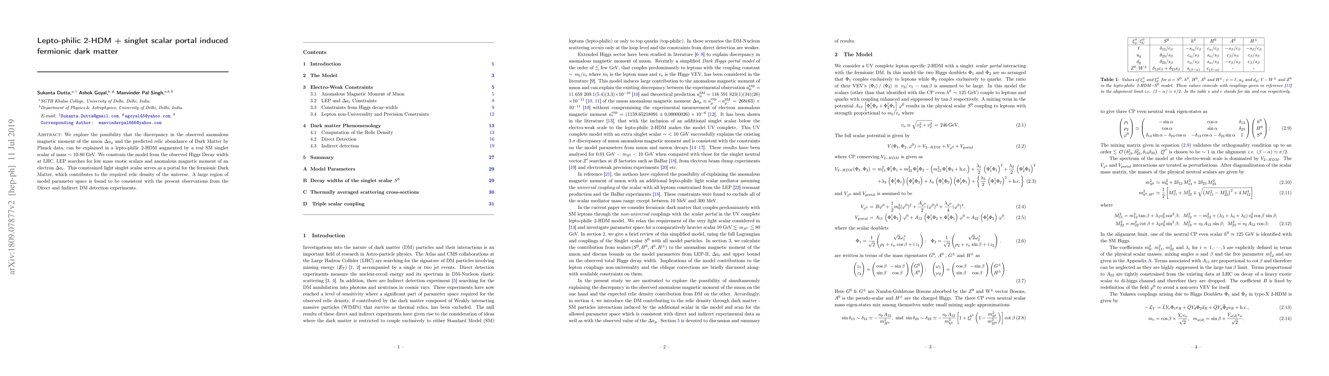 This paper investigates a lepto-philic 2-HDM model enhanced with a light singlet scalar to address the muon's anomalous magnetic moment and the discrepancy in Dark Matter's predicted relic abundance. The model's parameters are constrained by LHC, LEP, and electron magnetic moment data, and it finds a viable region for fermionic Dark Matter consistent with current DM detection experiments.