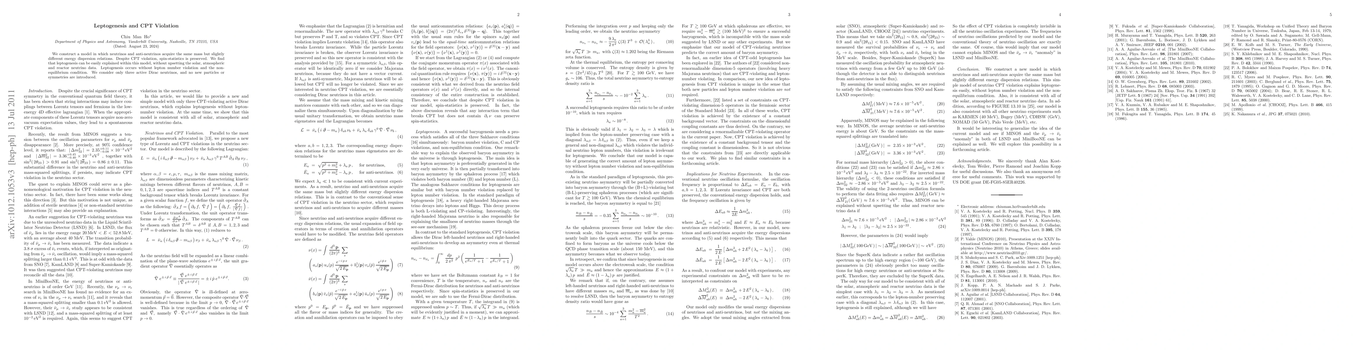 This paper proposes a model where neutrinos and anti-neutrinos have identical masses but distinct energy dispersions, leading to CPT violation without affecting spin-statistics. The model successfully explains leptogenesis without violating solar, atmospheric, or reactor neutrino data, and does so without requiring lepton number violation or non-equilibrium conditions.