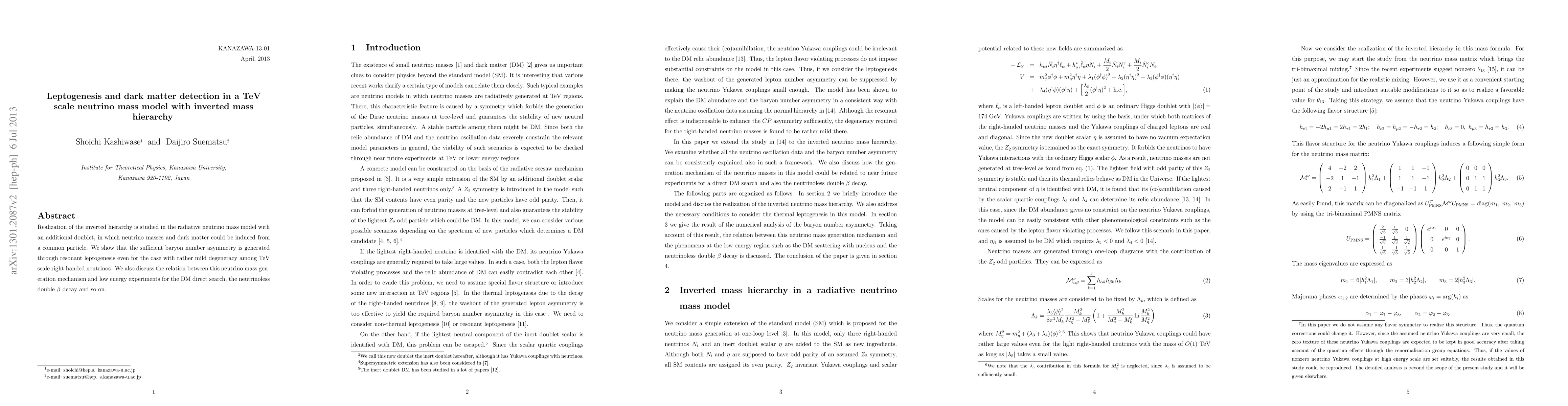 This paper explores a TeV scale neutrino mass model with inverted hierarchy, demonstrating how it can generate sufficient baryon asymmetry via resonant leptogenesis and link neutrino mass generation to dark matter detection, including implications for low-energy experiments like direct DM searches and neutrinoless double beta decay.