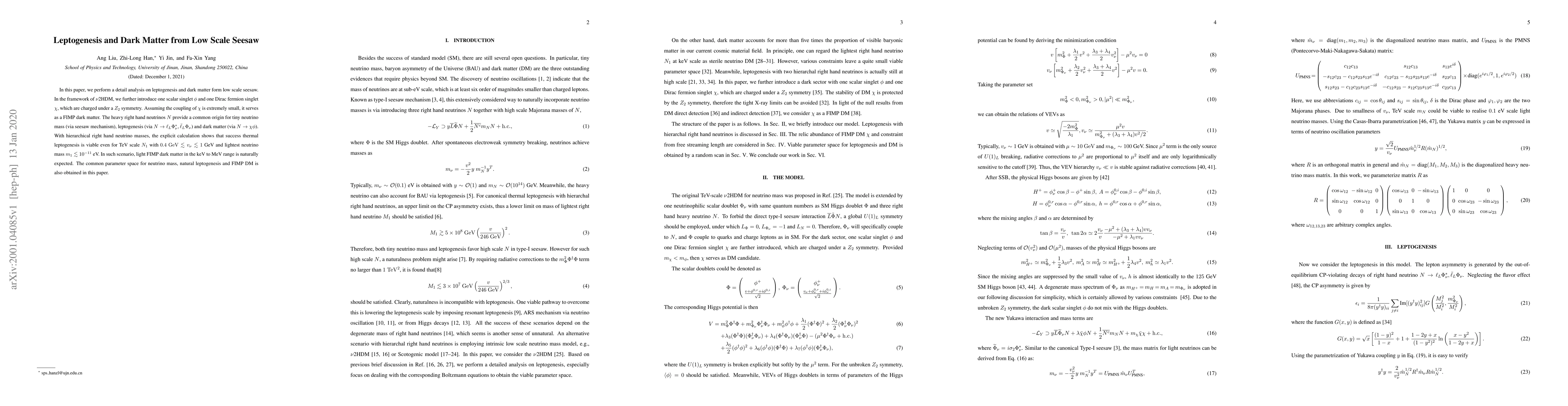 This paper investigates leptogenesis and dark matter in the context of low-scale seesaw models within the ν2HDM framework, introducing a scalar singlet and a Dirac fermion singlet. It finds that right-handed neutrinos can simultaneously explain tiny neutrino masses, successful thermal leptogenesis, and keV to MeV FIMP dark matter.