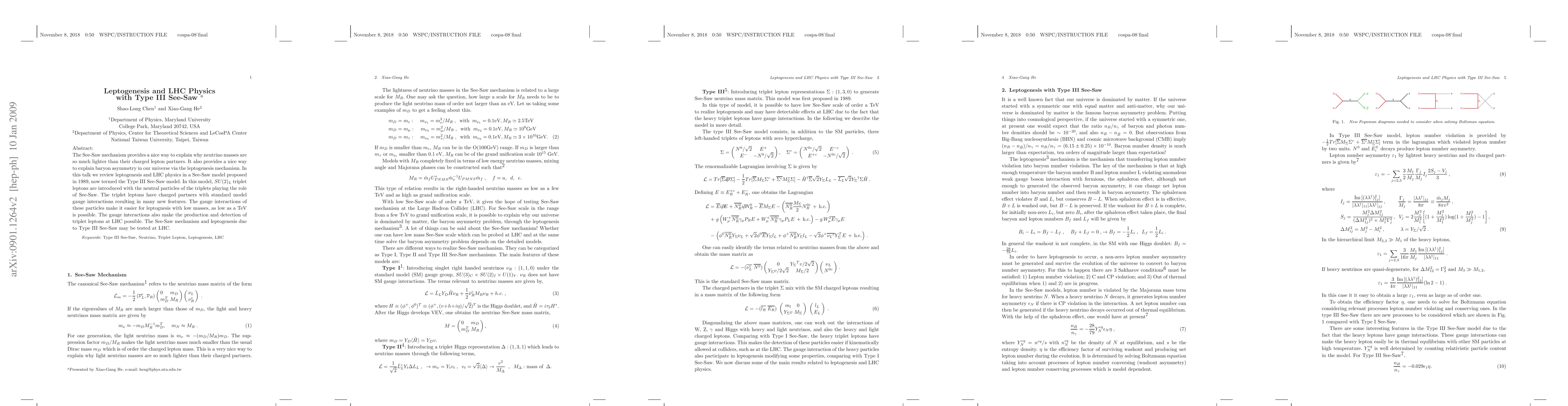 The See-Saw mechanism provides a nice way to explain why neutrino masses are so much lighter than their charged lepton partners. It also provides a nice way to explain baryon asymmetry in our universe via the leptogenesis mechanism. In this talk we review leptogenesis and LHC physics in a See-Saw model proposed in 1989, now termed the Type III See-Saw model. In this model, $SU(2)_L$ triplet leptons are introduced with the neutral particles of the triplets playing the role of See-Saw. The triplet leptons have charged partners with standard model gauge interactions resulting in many new features. The gauge interactions of these particles make it easier for leptognesis with low masses, as low as a TeV is possible. The gauge interactions also make the production and detection of triplet leptons at LHC possible. The See-Saw mechanism and leptogenesis due to Type III See-Saw may be tested at LHC.