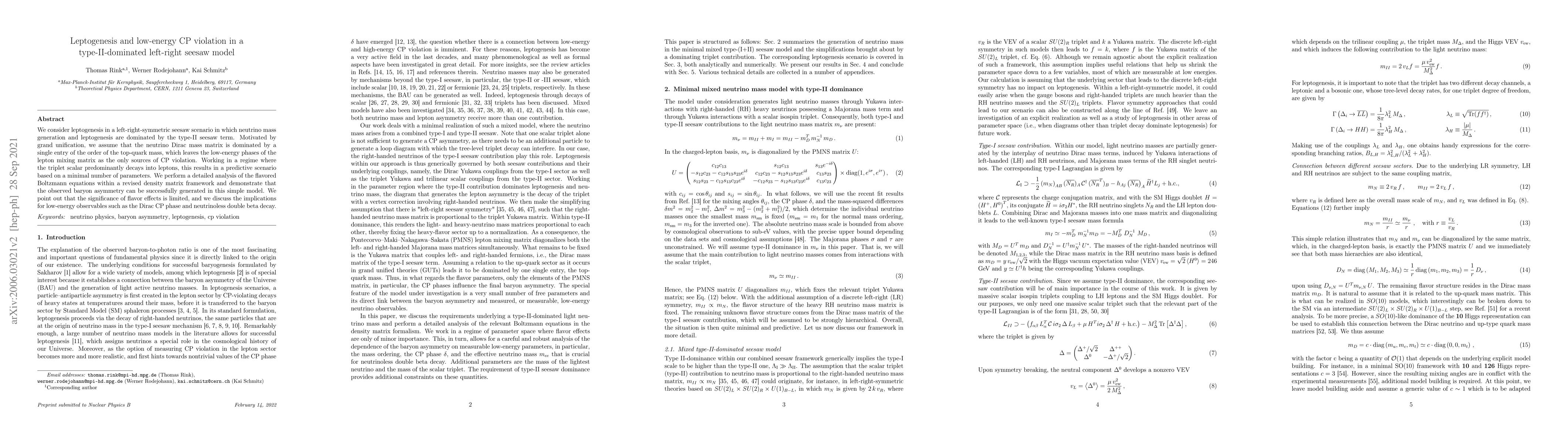 This paper explores leptogenesis in a left-right symmetric seesaw model dominated by type-II seesaw, predicting the observed baryon asymmetry through minimal parameters. It highlights the role of low-energy CP violation sources and discusses implications for the Dirac CP phase and neutrinoless double beta decay.