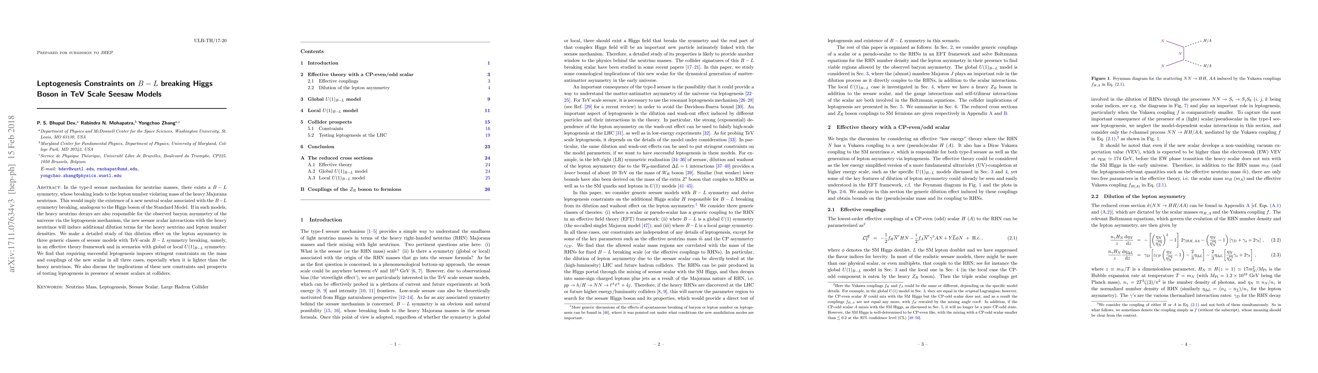 This paper investigates the constraints on a $B-L$ breaking Higgs boson in TeV-scale type-I seesaw models, focusing on the dilution effect of lepton asymmetry due to leptogenesis. It finds stringent limits on the mass and couplings of the new scalar, especially when it is lighter than the heavy neutrinos, and discusses collider test implications.