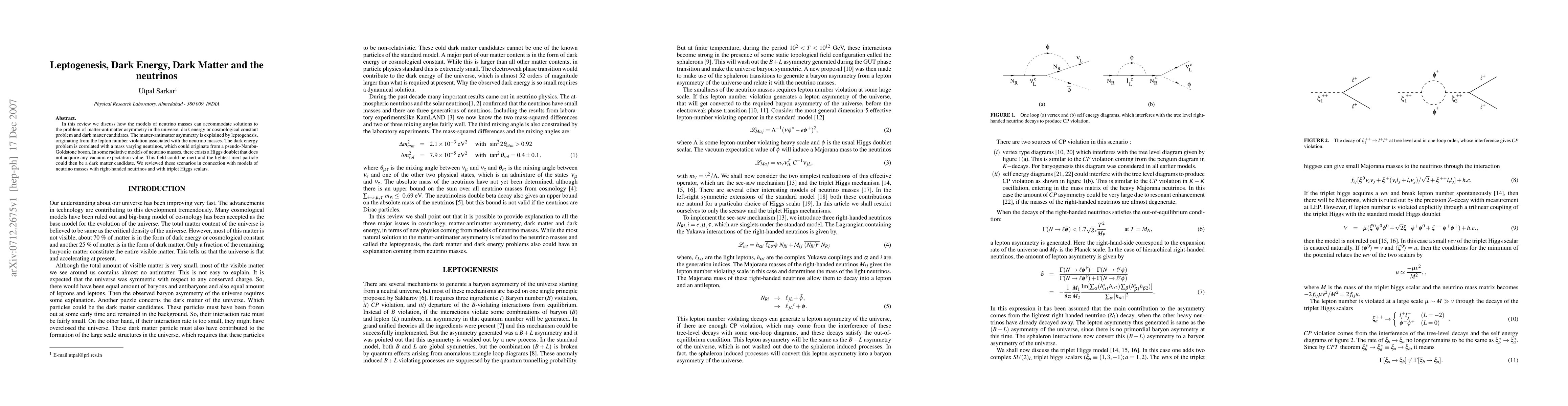 This review explores the interplay between neutrino masses, leptogenesis, dark energy, and dark matter, proposing that lepton number violation explains matter-antimatter asymmetry, mass-varying neutrinos address the dark energy problem, and inert Higgs doublets could serve as dark matter candidates. It connects these phenomena through models involving right-handed neutrinos and triplet Higgs scalars.