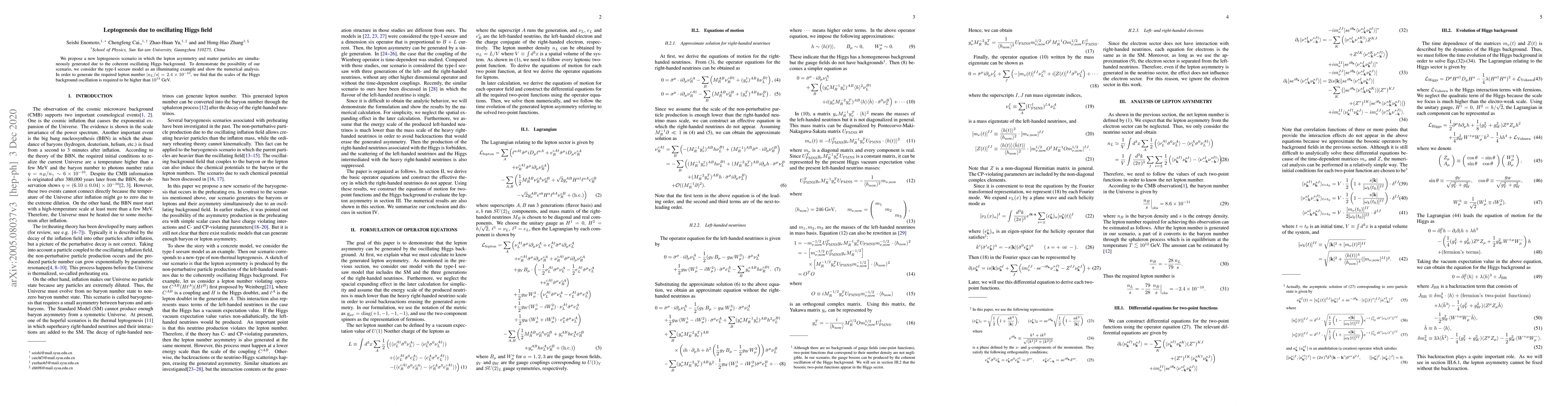 We propose a new leptogenesis scenario in which the lepton asymmetry and matter particles are simultaneously generated due to the coherent oscillating Higgs background. To demonstrate the possibility of our scenario, we consider the type-I seesaw model as an illuminating example and show the numerical analysis. In order to generate the required lepton number $|n_L/s| = 2.4 \times 10^{-10}$, we find that the scales of the Higgs background oscillation and the lightest right-handed neutrinos mass are required to be higher than $10^{14}$ GeV