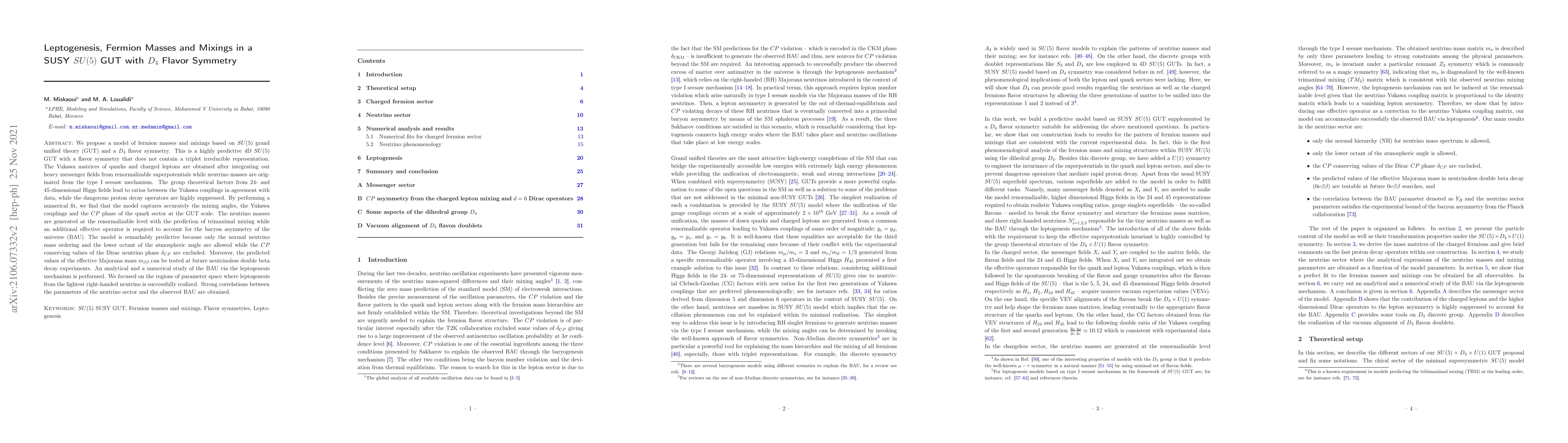 This paper proposes a SUSY $SU(5)$ GUT with $D_{4}$ flavor symmetry to predict fermion masses, mixings, and leptogenesis. The model generates Yukawa matrices and neutrino masses via the type I seesaw mechanism, accurately capturing quark mixing angles and CP phases, while predicting trimaximal mixing for neutrinos and excluding CP conserving values for $\delta_{CP}$.