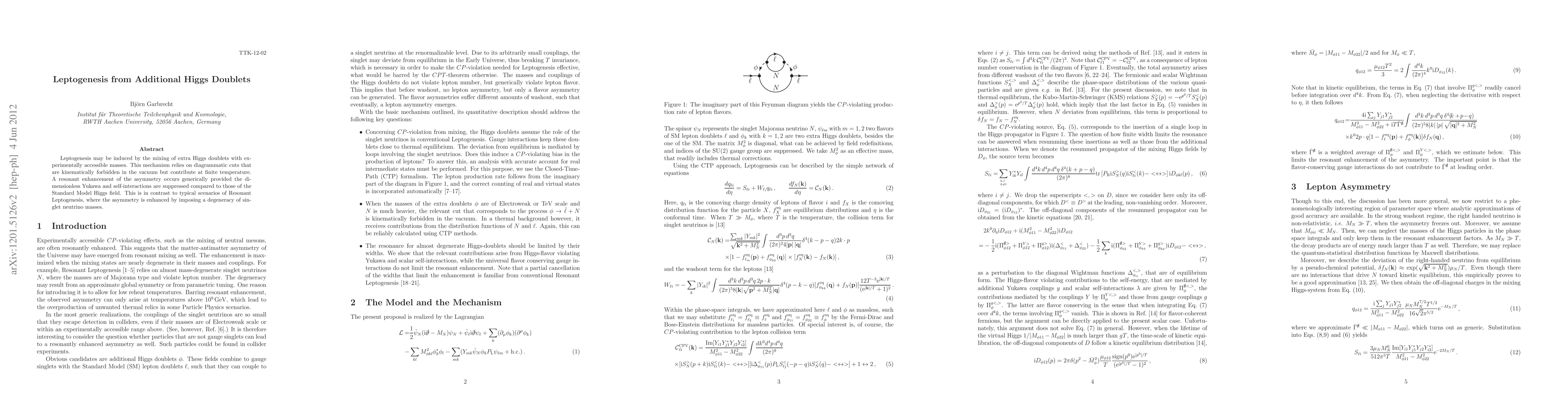 Summary: This paper explores leptogenesis via extra Higgs doublets, showing that asymmetry can arise from kinematically forbidden processes at finite temperatures, with resonant enhancement occurring when the Yukawa and self-interactions are suppressed compared to the Standard Model. This contrasts with typical resonant leptogenesis scenarios that rely on singlet neutrino mass degeneracies.