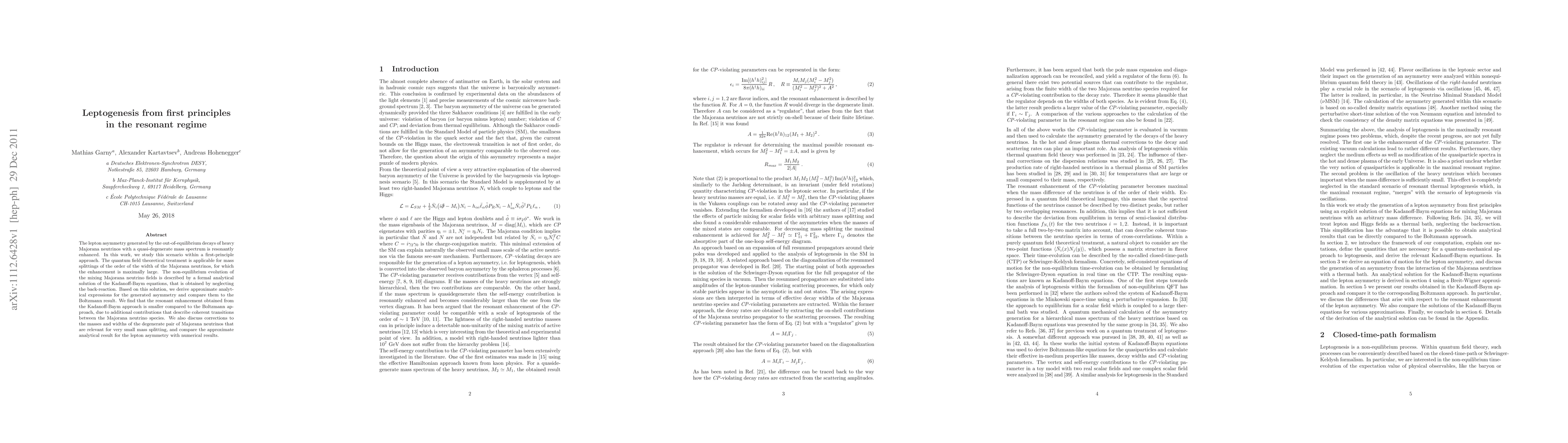 The lepton asymmetry generated by the out-of-equilibrium decays of heavy Majorana neutrinos with a quasi-degenerate mass spectrum is resonantly enhanced. In this work, we study this scenario within a first-principle approach. The quantum field theoretical treatment is applicable for mass splittings of the order of the width of the Majorana neutrinos, for which the enhancement is maximally large. The non-equilibrium evolution of the mixing Majorana neutrino fields is described by a formal analytical solution of the Kadanoff-Baym equations, that is obtained by neglecting the back-reaction. Based on this solution, we derive approximate analytical expressions for the generated asymmetry and compare them to the Boltzmann result. We find that the resonant enhancement obtained from the Kadanoff-Baym approach is smaller compared to the Boltzmann approach, due to additional contributions that describe coherent transitions between the Majorana neutrino species. We also discuss corrections to the masses and widths of the degenerate pair of Majorana neutrinos that are relevant for very small mass splitting, and compare the approximate analytical result for the lepton asymmetry with numerical results.
