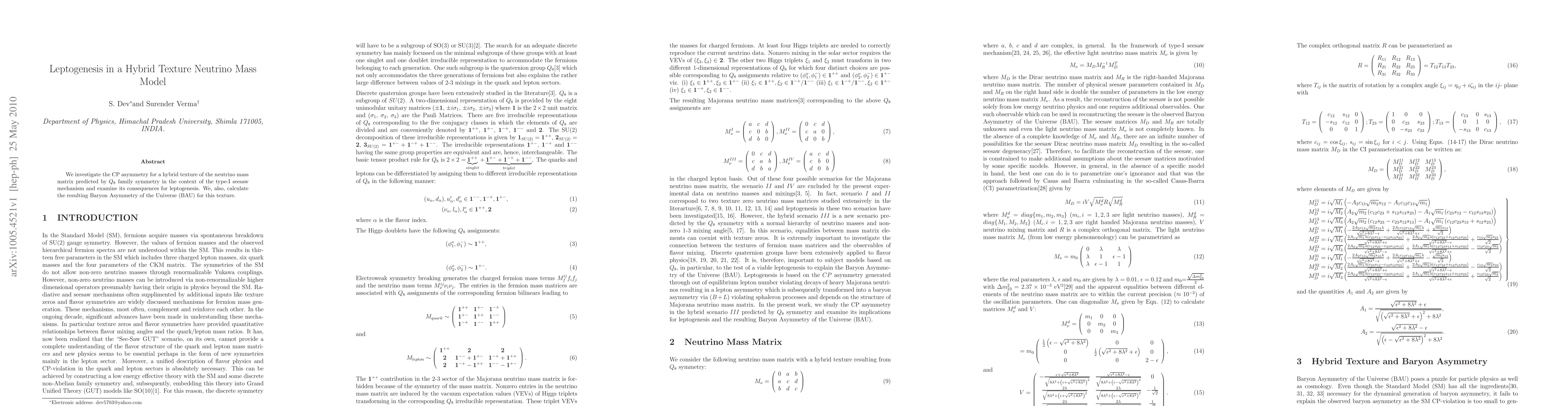 This paper explores the CP asymmetry in a hybrid texture neutrino mass model derived from $Q_8$ family symmetry, utilizing the type-I seesaw mechanism to study leptogenesis and calculate the resulting Baryon Asymmetry of the Universe (BAU).