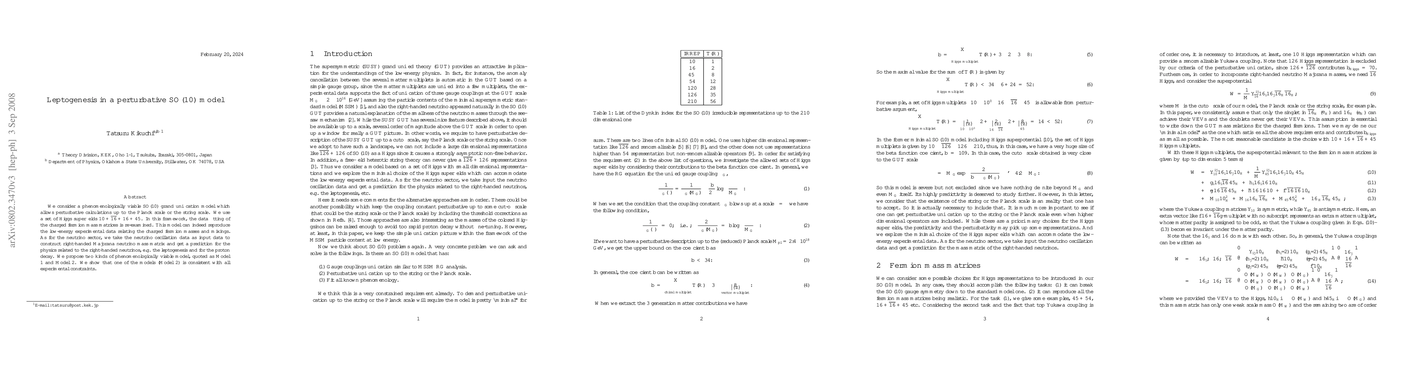 We consider a phenomenologically viable SO(10) grand unification model which allows perturbative calculations up to the Planck scale or the string scale. We use a set of Higgs superfields {10 + 16bar + 16 + 45}. In this framework, the data fitting of the charged fermion mass matrices is re-examined. This model can indeed reproduce the low-energy experimental data relating the charged fermion masses and mixings. As for the neutrino sector, we take the neutrino oscillation data as input data to construct right-handed Majorana neutrino mass matrix and get a prediction for the physics related to the right-handed neutrinos, e.g. the leptogenesis and for the proton decay. We propose two kinds of phenomenologically viable model, quoted as Model 1 and Model 2. We show that one of the models (Model 2) is consistent with all experimental constraints.
