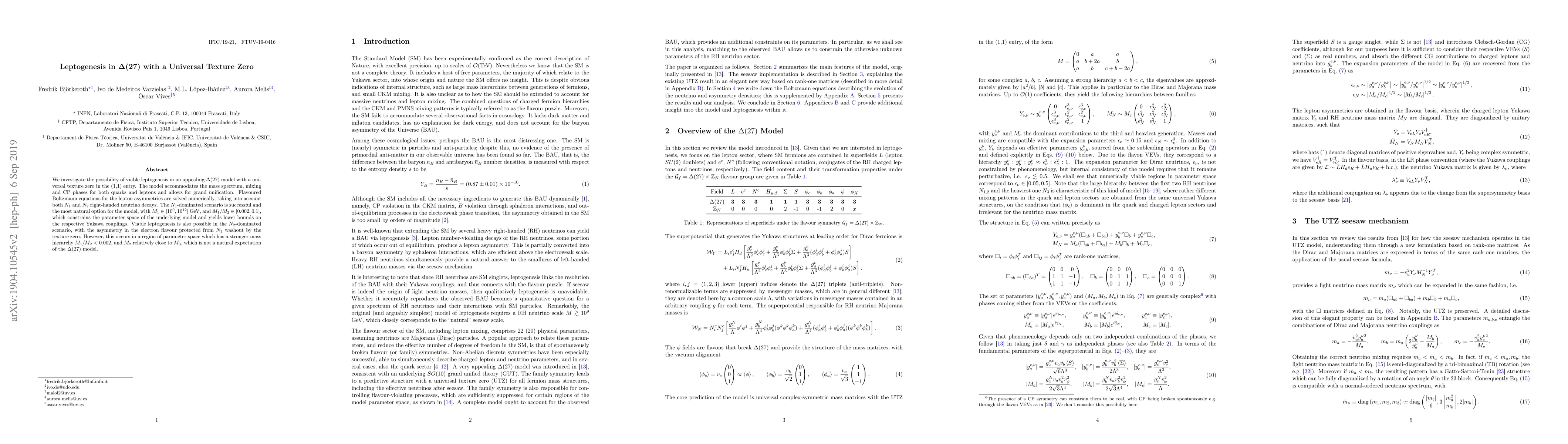 We investigate the possibility of viable leptogenesis in an appealing $\Delta(27)$ model with a universal texture zero in the (1,1) entry. The model accommodates the mass spectrum, mixing and CP phases for both quarks and leptons and allows for grand unification. Flavoured Boltzmann equations for the lepton asymmetries are solved numerically, taking into account both $N_1$ and $N_2$ right-handed neutrino decays. The $N_1$-dominated scenario is successful and the most natural option for the model, with $M_1 \in [10^9, 10^{12}]$ GeV, and $M_1/M_2 \in [0.002, 0.1]$, which constrains the parameter space of the underlying model and yields lower bounds on the respective Yukawa couplings. Viable leptogenesis is also possible in the $N_2$-dominated scenario, with the asymmetry in the electron flavour protected from $N_1$ washout by the texture zero. However, this occurs in a region of parameter space which has a stronger mass hierarchy $M_1/M_2 < 0.002 $, and $M_2$ relatively close to $M_3$, which is not a natural expectation of the $\Delta(27)$ model.