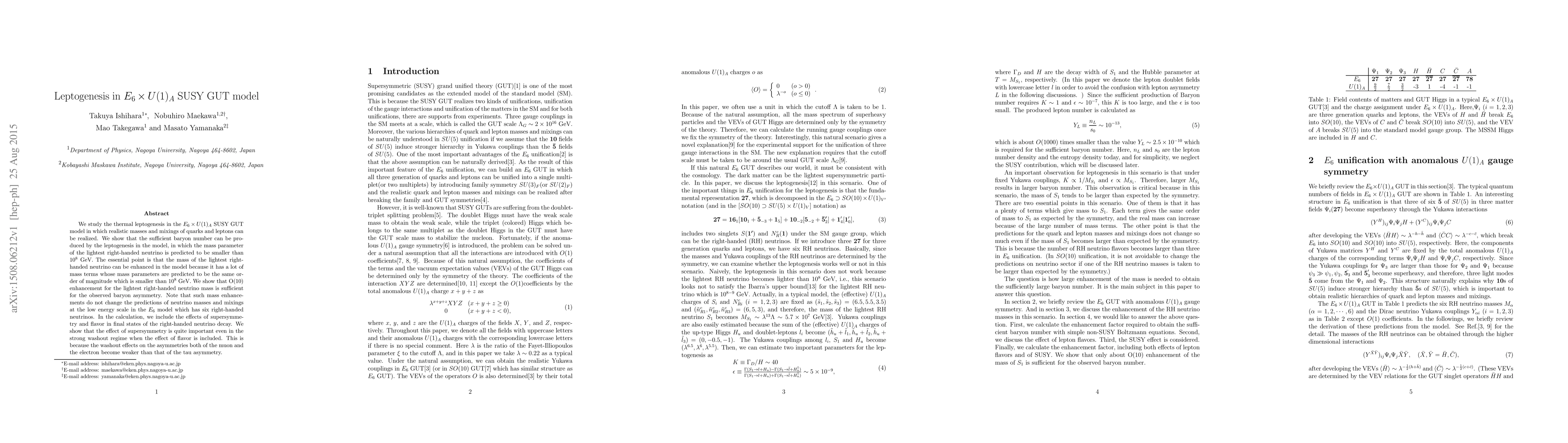 This paper investigates thermal leptogenesis in an $E_6 \times U(1)_A$ SUSY GUT model, demonstrating that sufficient baryon asymmetry can be generated with the lightest right-handed neutrino's mass below $10^8$ GeV. The model predicts an O(10) enhancement for the lightest right-handed neutrino's mass, crucial for achieving observed baryon asymmetry without altering low-energy neutrino properties.