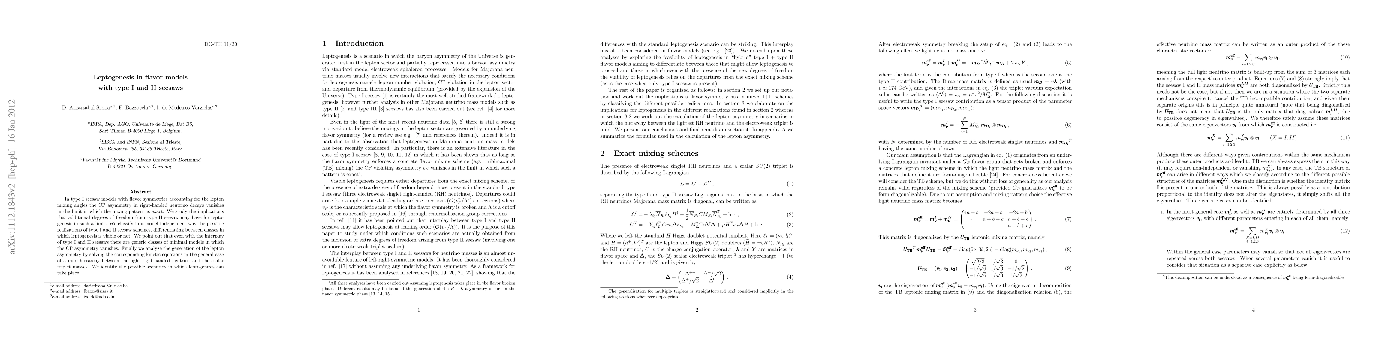 In type I seesaw models with flavor symmetries accounting for the lepton mixing angles the CP asymmetry in right-handed neutrino decays vanishes in the limit in which the mixing pattern is exact. We study the implications that additional degrees of freedom from type II seesaw may have for leptogenesis in such a limit. We classify in a model independent way the possible realizations of type I and II seesaw schemes, differentiating between classes in which leptogenesis is viable or not. We point out that even with the interplay of type I and II seesaws there are generic classes of minimal models in which the CP asymmetry vanishes. Finally we analyze the generation of the lepton asymmetry by solving the corresponding kinetic equations in the general case of a mild hierarchy between the light right-handed neutrino and the scalar triplet masses. We identify the possible scenarios in which leptogenesis can take place.