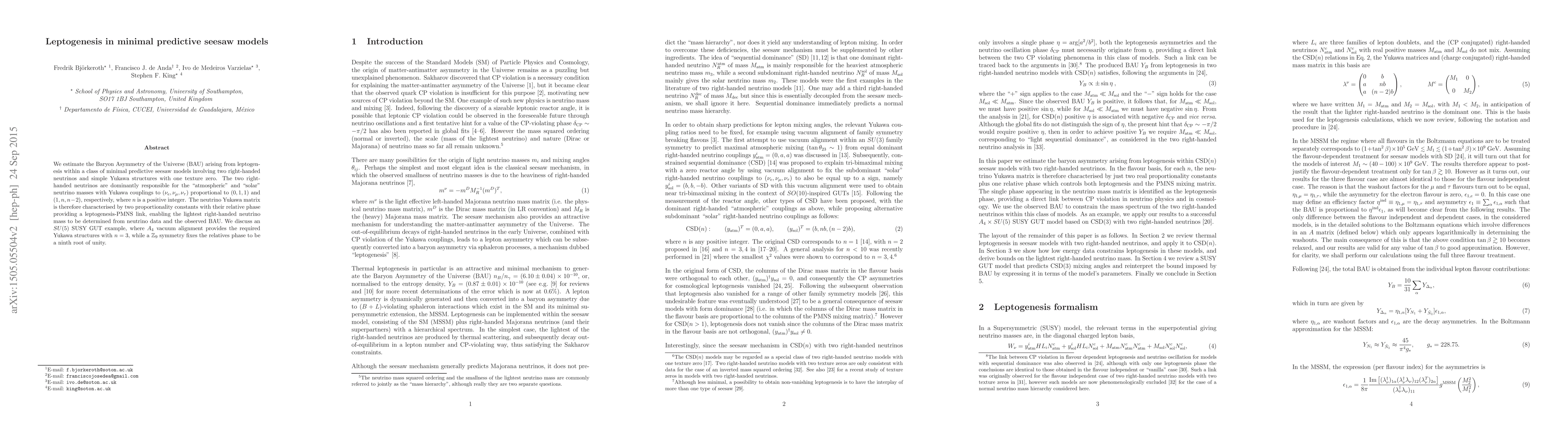 We estimate the Baryon Asymmetry of the Universe (BAU) arising from leptogenesis within a class of minimal predictive seesaw models involving two right-handed neutrinos and simple Yukawa structures with one texture zero. The two right-handed neutrinos are dominantly responsible for the "atmospheric" and "solar" neutrino masses with Yukawa couplings to $(\nu_e, \nu_{\mu}, \nu_{\tau})$ proportional to $(0,1,1)$ and $(1,n,n-2)$, respectively, where $n$ is a positive integer. The neutrino Yukawa matrix is therefore characterised by two proportionality constants with their relative phase providing a leptogenesis-PMNS link, enabling the lightest right-handed neutrino mass to be determined from neutrino data and the observed BAU. We discuss an $SU(5)$ SUSY GUT example, where $A_4$ vacuum alignment provides the required Yukawa structures with $n=3$, while a $\mathbb{Z}_9$ symmetry fixes the relatives phase to be a ninth root of unity.