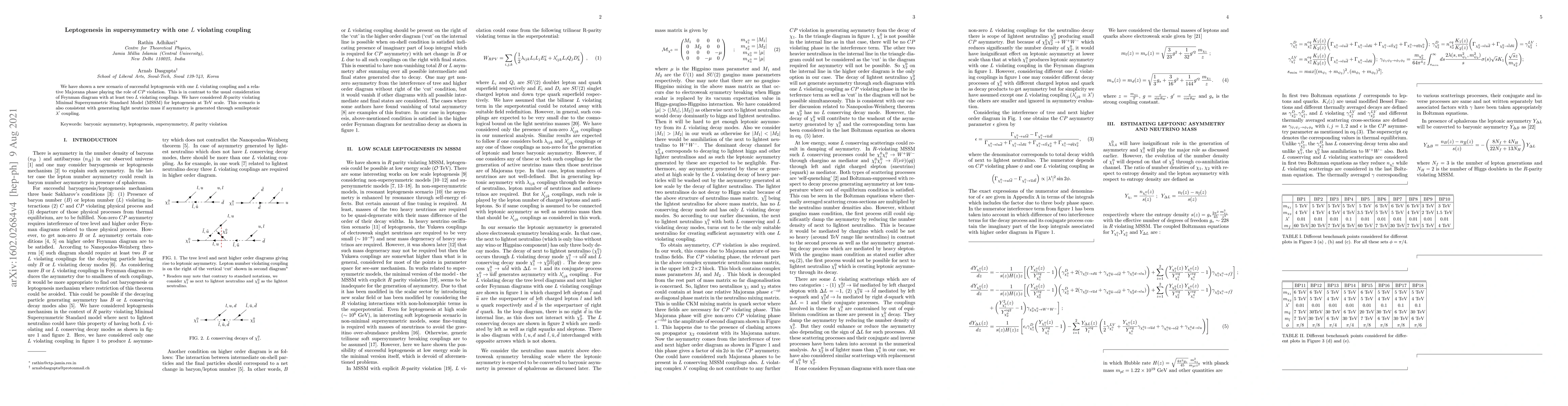 We have shown a new scenario of successful leptogenesis with one $L$ violating coupling and a relative Majorana phase playing the role of $CP$ violation. This is in contrast to the usual consideration of Feynman diagram with at least two $L$ violating couplings. We have considered $R$-parity violating Minimal Supersymmetric Standard Model (MSSM) for leptogenesis at TeV scale. This scenario is also consistent with generating light neutrino mass if asymmetry is generated through semileptonic $\lambda^{\prime}$ coupling.