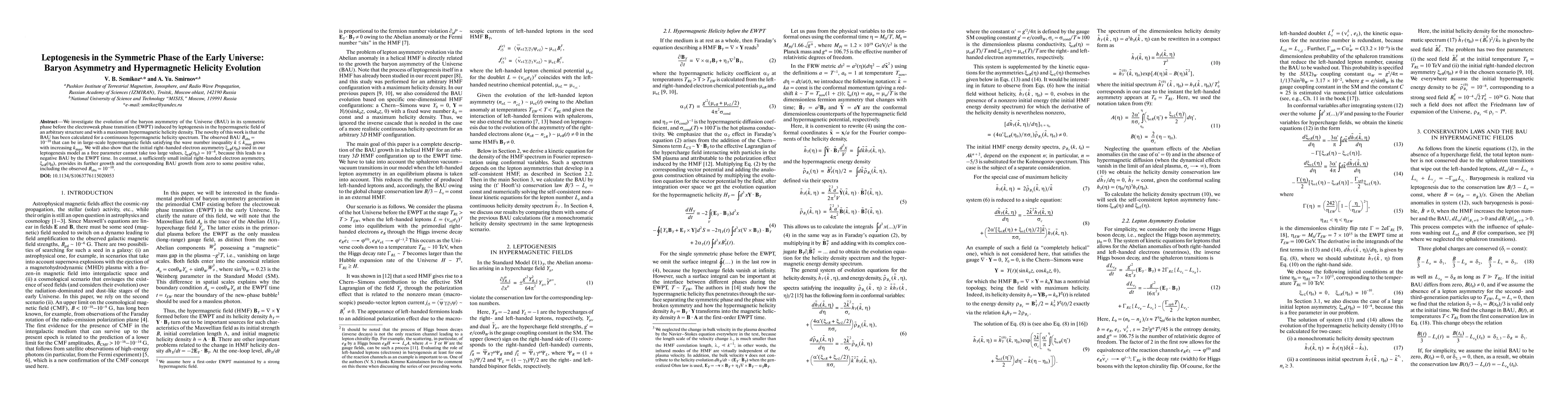 This paper explores the generation of baryon asymmetry in the early Universe's symmetric phase through leptogenesis in hypermagnetic fields, showing that the observed baryon asymmetry can be achieved with a continuous hypermagnetic helicity spectrum. It finds that a small initial right-handed electron asymmetry is necessary for the baryon asymmetry to grow positively, avoiding negative values.