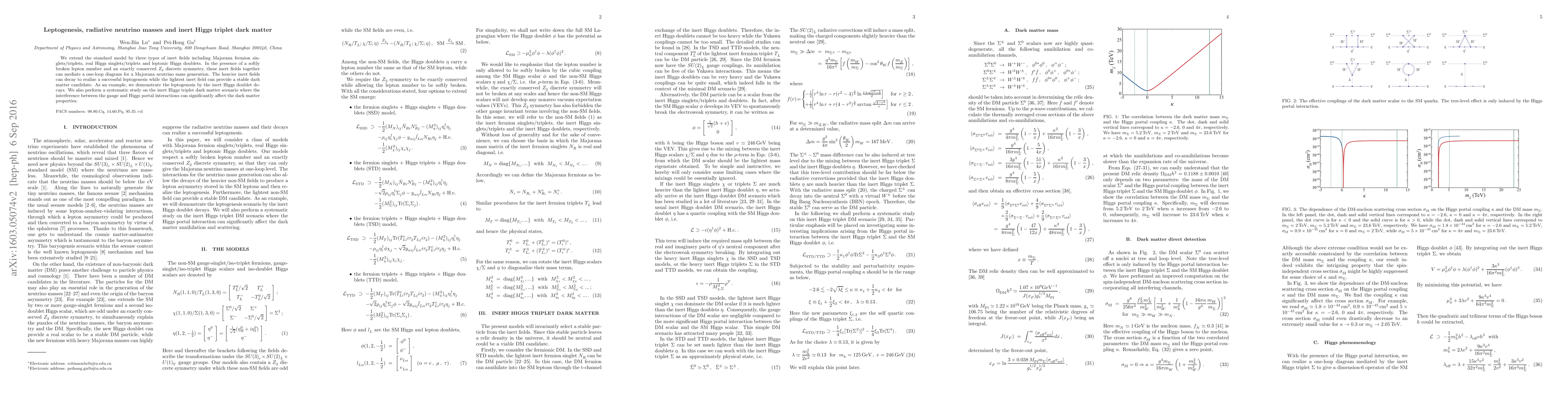 This paper extends the Standard Model with inert Majorana fermion singlets/triplets, real Higgs singlets/triplets, and leptonic Higgs doublets. It explores leptogenesis via inert field decays and proposes a stable dark matter candidate from the lightest inert field, with a focus on the inert Higgs triplet's properties influenced by gauge and Higgs portal interactions.