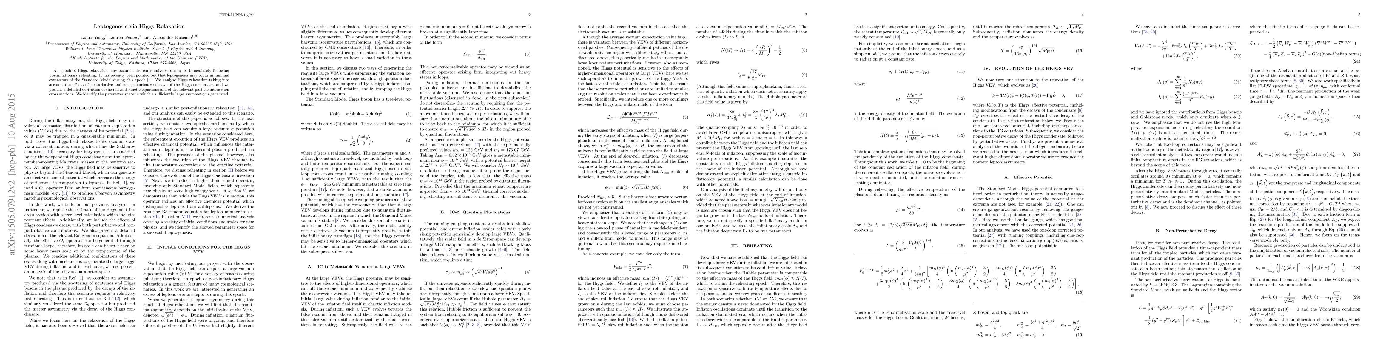 An epoch of Higgs relaxation may occur in the early universe during or immediately following postinflationary reheating. It has recently been pointed out that leptogenesis may occur in minimal extensions of the Standard Model during this epoch. We analyse Higgs relaxation taking into account the effects of perturbative and non-perturbative decays of the Higgs condensate, and we present a detailed derivation of the relevant kinetic equations and of the relevant particle interaction cross sections. We identify the parameter space in which a sufficiently large asymmetry is generated.