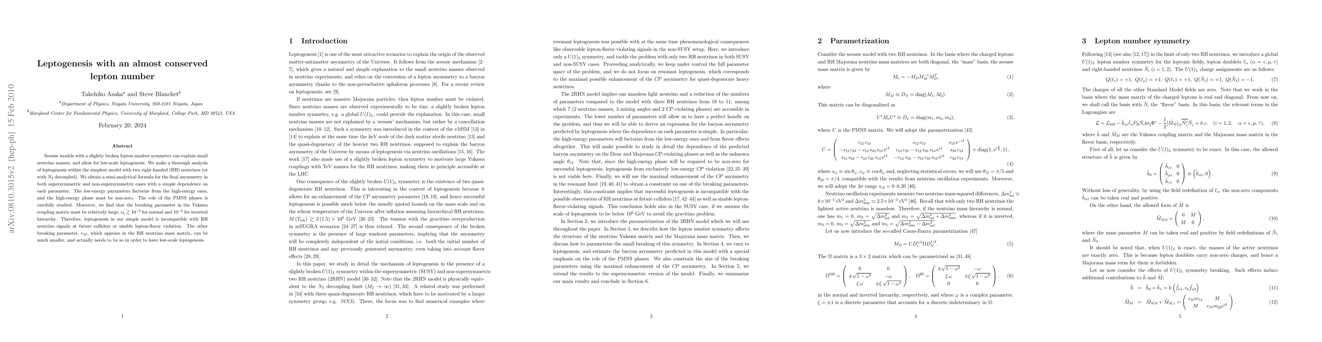 Seesaw models with a slightly broken lepton number symmetry can explain small neutrino masses, and allow for low-scale leptogenesis. We make a thorough analysis of leptogenesis within the simplest model with two right-handed (RH) neutrinos (or with N_3 decoupled). We obtain a semi-analytical formula for the final asymmetry in both supersymmetric and non-supersymmetric cases with a simple dependence on each parameter. The low-energy parameters factorize from the high-energy ones, and the high-energy phase must be non-zero. The role of the PMNS phases is carefully studied. Moreover, we find that the breaking parameter in the Yukawa coupling matrix must be relatively large, \epsilon_h > 10^{-3} for normal and 10^{-2} for inverted hierarchy. Therefore, leptogenesis in our simple model is incompatible with RH neutrino signals at future colliders or sizable lepton-flavor violation. The other breaking parameter, \epsilon_M, which appears in the RH neutrino mass matrix, can be much smaller, and actually needs to be so in order to have low-scale leptogenesis.