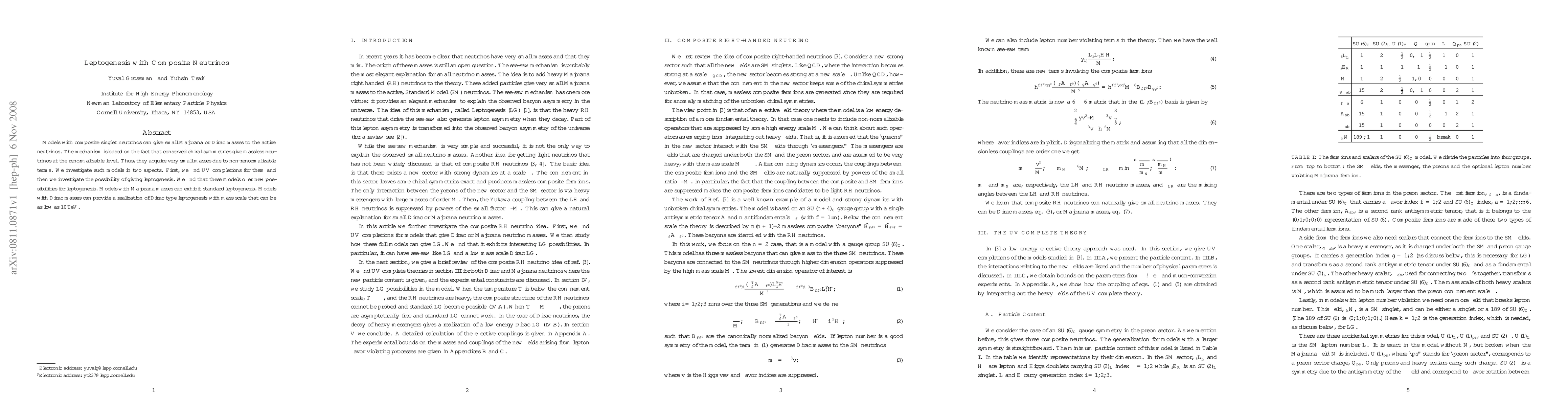 This paper explores composite neutrino models that generate small Majorana or Dirac masses through non-renormalizable terms, proposing UV completions and investigating their potential for leptogenesis, including both standard and Dirac type leptogenesis with low mass scales.