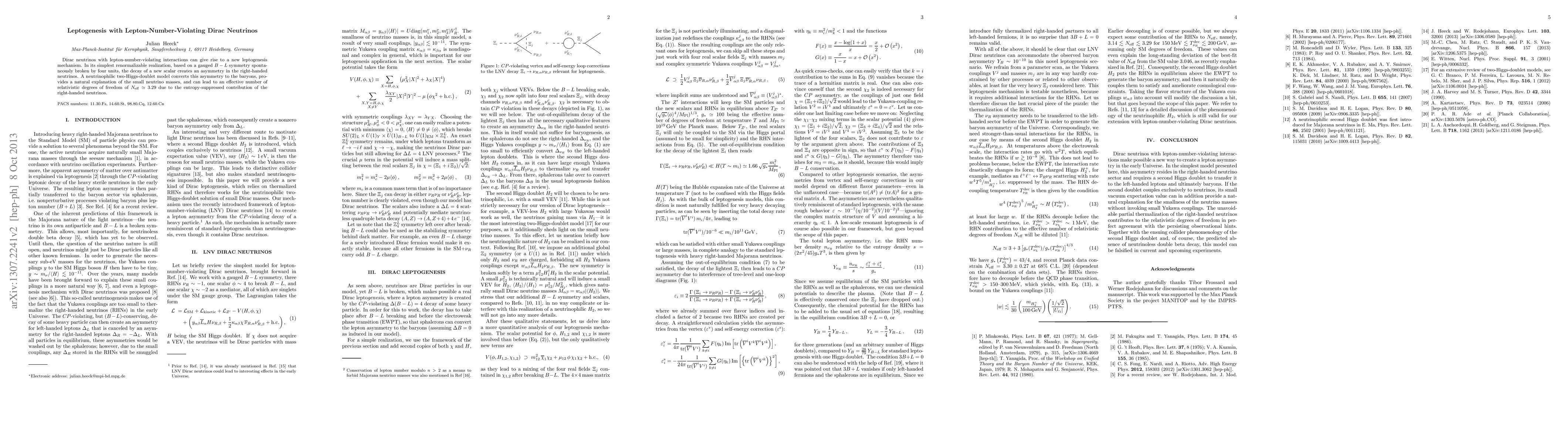 A new leptogenesis mechanism is proposed based on Dirac neutrinos with lepton-number-violating interactions, which can explain small neutrino masses and lead to an effective number of relativistic degrees of freedom.