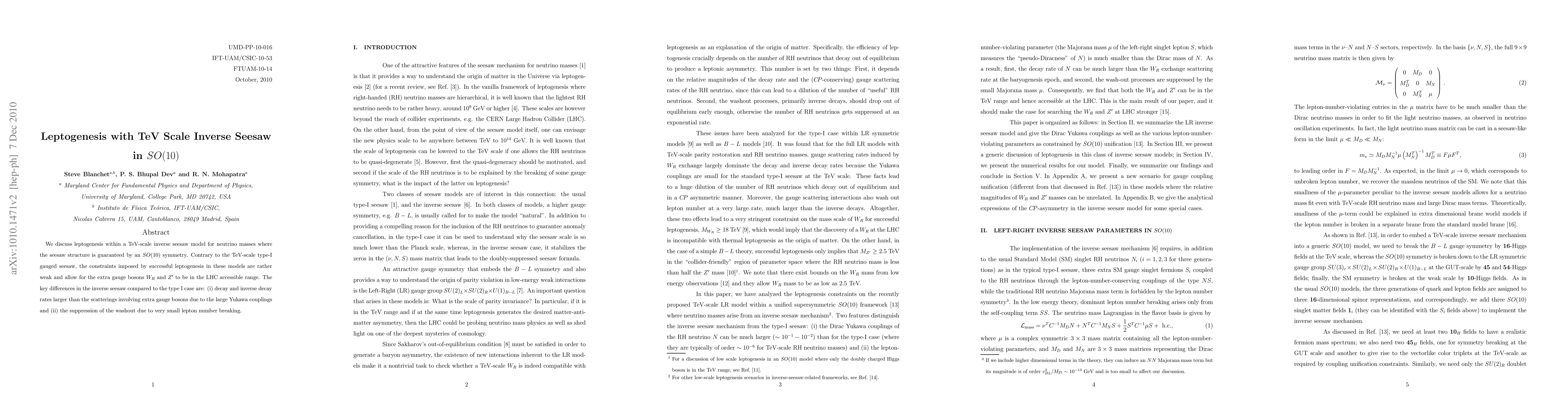 This paper explores leptogenesis in a TeV-scale inverse seesaw model for neutrino masses within an SO(10) symmetry framework. Unlike the type-I seesaw, this model allows for LHC-accessible extra gauge bosons due to weak leptogenesis constraints, with key differences including larger decay rates and reduced washout due to minimal lepton number violation.