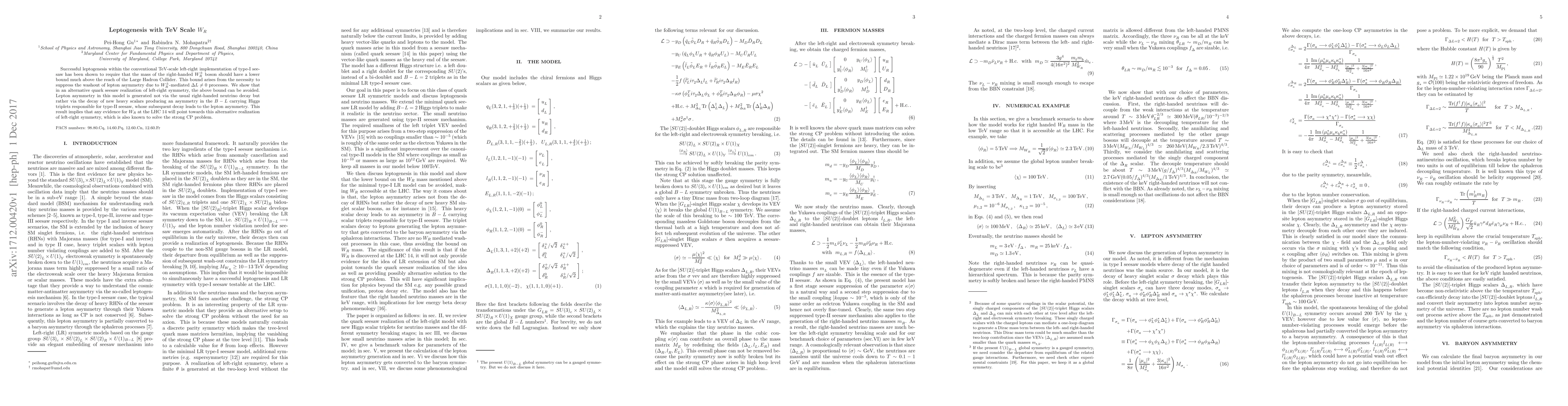 The paper proposes an alternative leptogenesis model using quark seesaw and left-right symmetry, bypassing the TeV-scale $W_R$ mass bound. This model generates lepton asymmetry through heavy scalar decay, potentially solving the strong CP problem. Evidence for $W_R$ at LHC 14 would suggest this alternative realization of left-right symmetry.