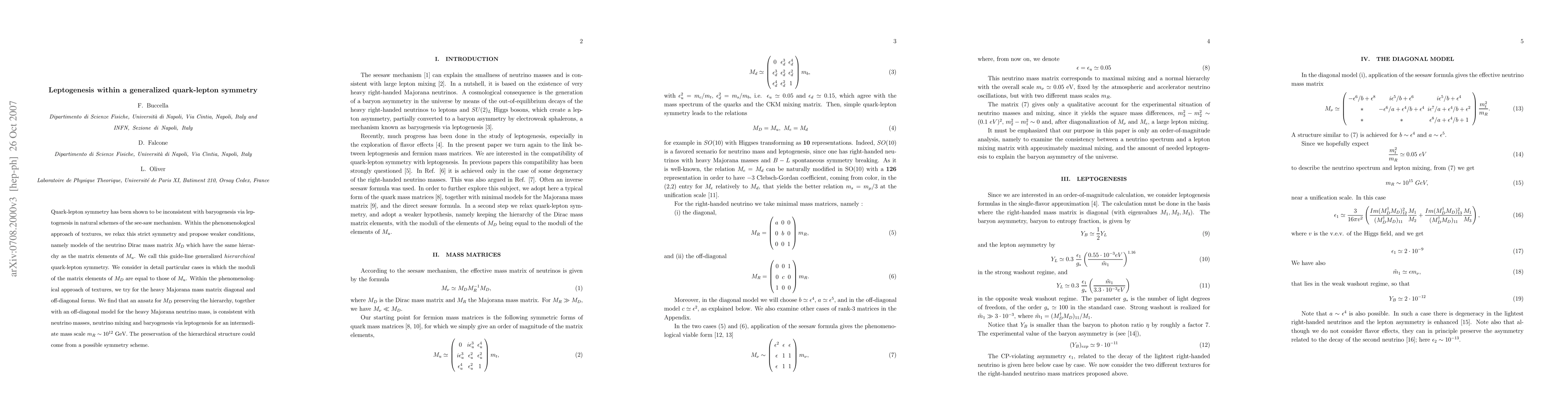 Quark-lepton symmetry has been shown to be inconsistent with baryogenesis via leptogenesis in natural schemes of the see-saw mechanism. Within the phenomenological approach of textures, we relax this strict symmetry and propose weaker conditions, namely models of the neutrino Dirac mass matrix $M_D$ which have the same hierarchy as the matrix elements of $M_u$. We call this guide-line generalized $hierarchical$ quark-lepton symmetry. We consider in detail particular cases in which the moduli of the matrix elements of $M_D$ are equal to those of $M_u$. Within the phenomenological approach of textures, we try for the heavy Majorana mass matrix diagonal and off-diagonal forms. We find that an ansatz for $M_D$ preserving the hierarchy, together with an off-diagonal model for the heavy Majorana neutrino mass, is consistent with neutrino masses, neutrino mixing and baryogenesis via leptogenesis for an intermediate mass scale $m_R \sim 10^{12}$ GeV. The preservation of the hierarchical structure could come from a possible symmetry scheme.