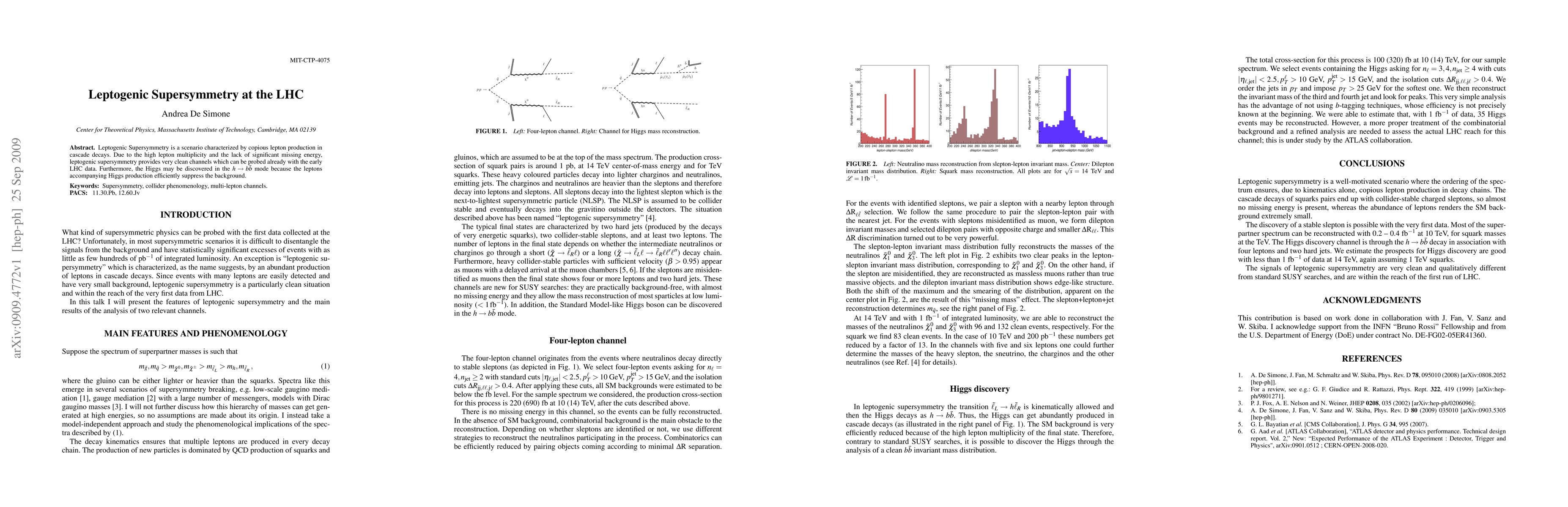 Leptogenic Supersymmetry at the LHC: This scenario features abundant lepton creation from cascade decays, offering clear detection channels with early LHC data. The Higgs boson could be identified in the h->b bbar mode, as accompanying leptons reduce background noise effectively.