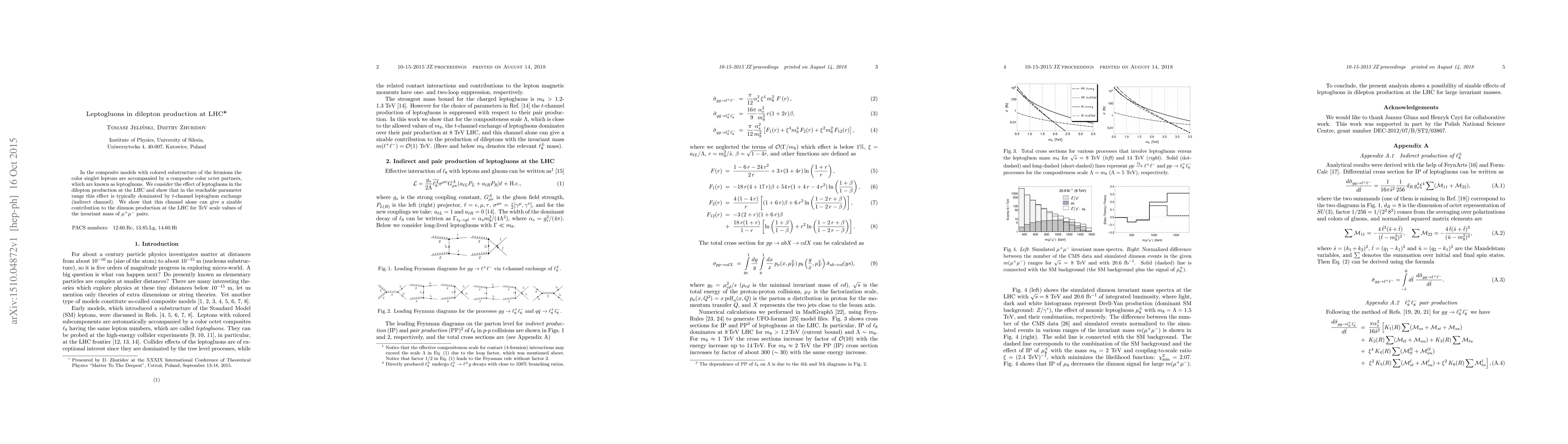 In the composite models with colored substructure of the fermions the color singlet leptons are accompanied by a composite color octet partners, which are known as leptogluons. We consider the effect of leptogluons in the dilepton production at the LHC and show that in the reachable parameter range this effect is typically dominated by t-channel leptogluon exchange (indirect channel). We show that this channel alone can give a sizable contribution to the dimuon production at the LHC for TeV scale values of the invariant mass of the muon-antimuon pairs.