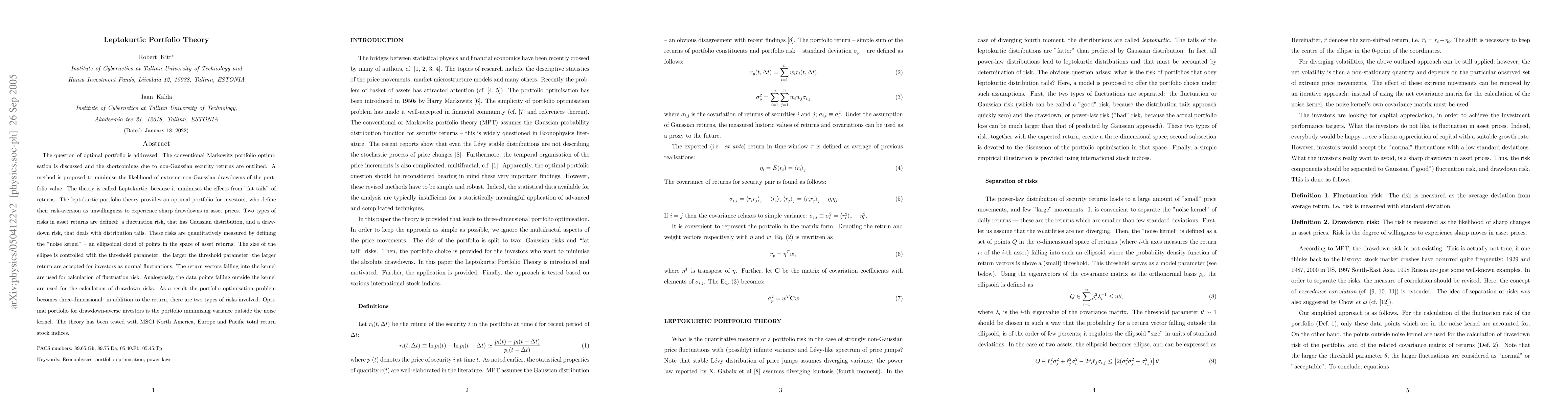 The question of optimal portfolio is addressed. The conventional Markowitz portfolio optimisation is discussed and the shortcomings due to non-Gaussian security returns are outlined. A method is proposed to minimise the likelihood of extreme non-Gaussian drawdowns of the portfolio value. The theory is called Leptokurtic, because it minimises the effects from "fat tails" of returns. The leptokurtic portfolio theory provides an optimal portfolio for investors, who define their risk-aversion as unwillingness to experience sharp drawdowns in asset prices. Two types of risks in asset returns are defined: a fluctuation risk, that has Gaussian distribution, and a drawdown risk, that deals with distribution tails. These risks are quantitatively measured by defining the "noise kernel" -- an ellipsoidal cloud of points in the space of asset returns. The size of the ellipse is controlled with the threshold parameter: the larger the threshold parameter, the larger return are accepted for investors as normal fluctuations. The return vectors falling into the kernel are used for calculation of fluctuation risk. Analogously, the data points falling outside the kernel are used for the calculation of drawdown risks. As a result the portfolio optimisation problem becomes three-dimensional: in addition to the return, there are two types of risks involved. Optimal portfolio for drawdown-averse investors is the portfolio minimising variance outside the noise kernel. The theory has been tested with MSCI North America, Europe and Pacific total return stock indices.