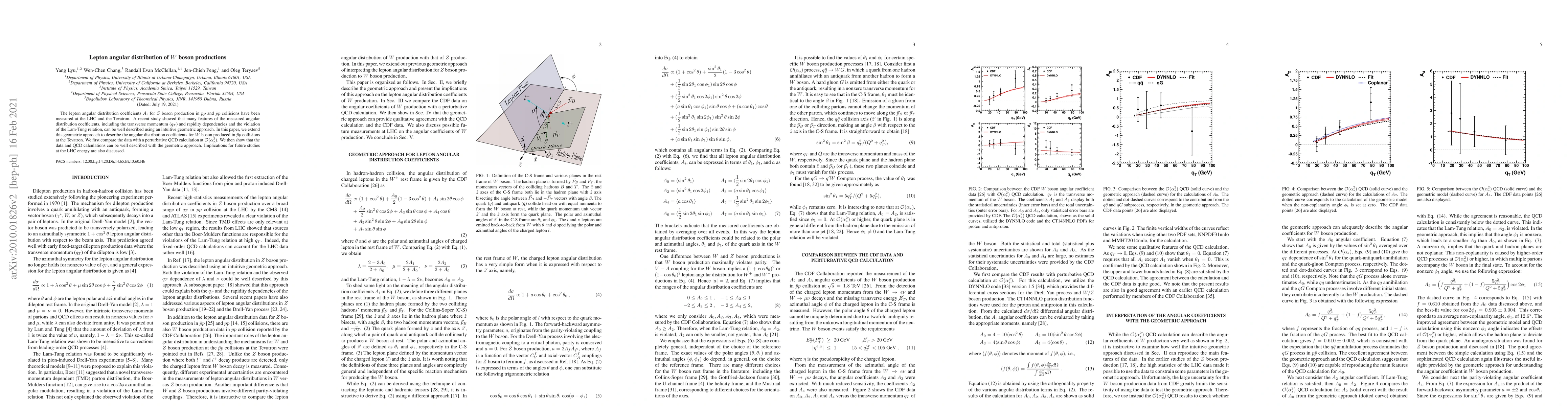 This paper extends a geometric approach to describe the angular distribution coefficients for $W$ bosons produced in $\bar{p} p$ collisions at the Tevatron, comparing data with perturbative QCD calculations and showing its effectiveness. Implications for future LHC studies are also discussed.