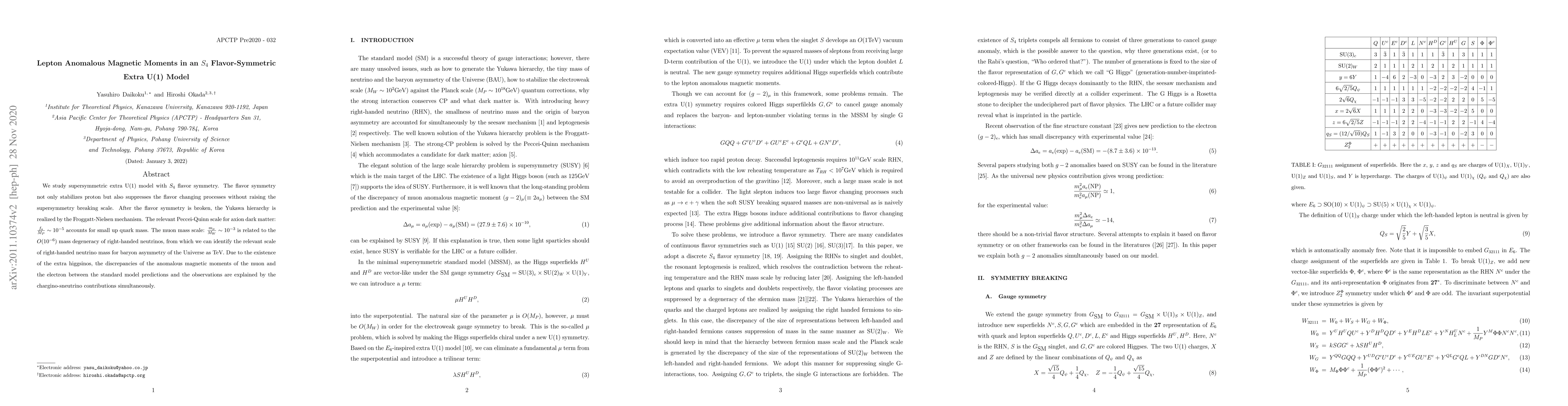 This paper investigates a supersymmetric extra U(1) model with $S_4$ flavor symmetry that stabilizes the proton and suppresses flavor-changing processes. It explains lepton anomalous magnetic moments via chargino-sneutrino contributions, aligning the muon mass with right-handed neutrino mass degeneracies and providing a Peccei-Quinn scale for axion dark matter.