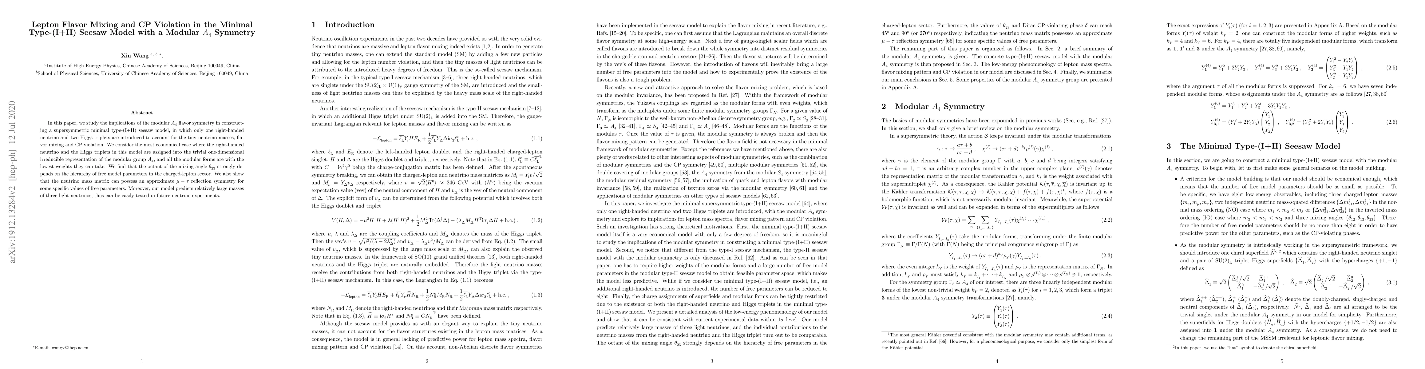 In this paper, we study the implications of the modular $A^{}_4$ flavor symmetry in constructing a supersymmetric minimal type-(I+II) seesaw model, in which only one right-handed neutrino and two Higgs triplets are introduced to account for the tiny neutrino masses, flavor mixing and CP violation. The right-handed neutrino as well as the Higgs triplets in this model are assigned into the trivial one-dimensional irreducible representation of the modular group $A^{}_{4}$. We show that the individual contributions to the neutrino masses from the right-handed neutrino and the Higgs triplet are comparable. We also find that the neutrino mass matrix can possess an approximate $\mu-\tau$ reflection symmetry for some specific values of free model parameters. Moreover, our model predicts relatively large masses of three light neutrinos, thus can be easily tested in future neutrino experiments.