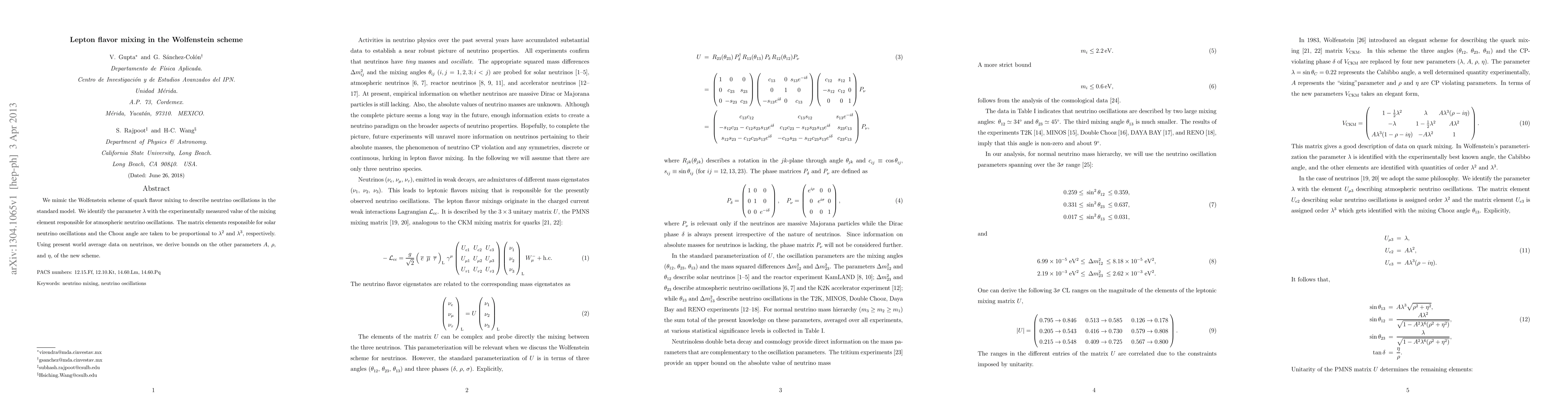 Researchers used the Wolfenstein scheme to model neutrino oscillations, identifying a key parameter lambda that matches atmospheric neutrino data. Bounds on other parameters A, rho, and eta were derived using world average data on neutrinos.