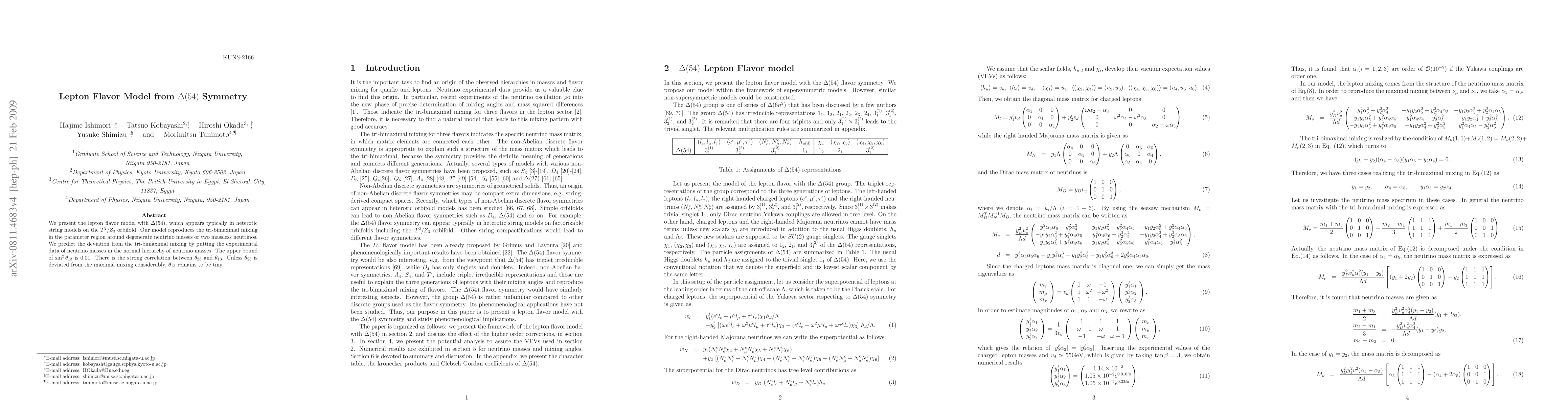 We present the lepton flavor model with $\Delta (54)$, which appears typically in heterotic string models on the $T^2/Z_3$ orbifold. Our model reproduces the tri-bimaximal mixing in the parameter region around degenerate neutrino masses or two massless neutrinos. We predict the deviation from the tri-bimaximal mixing by putting the experimental data of neutrino masses in the normal hierarchy of neutrino masses. The upper bound of $\sin^2\theta_{13}$ is 0.01. There is the strong correlation between $\theta_{23}$ and $\theta_{13}$. Unless $\theta_{23}$ is deviated from the maximal mixing considerably, $\theta_{13}$ remains to be tiny.