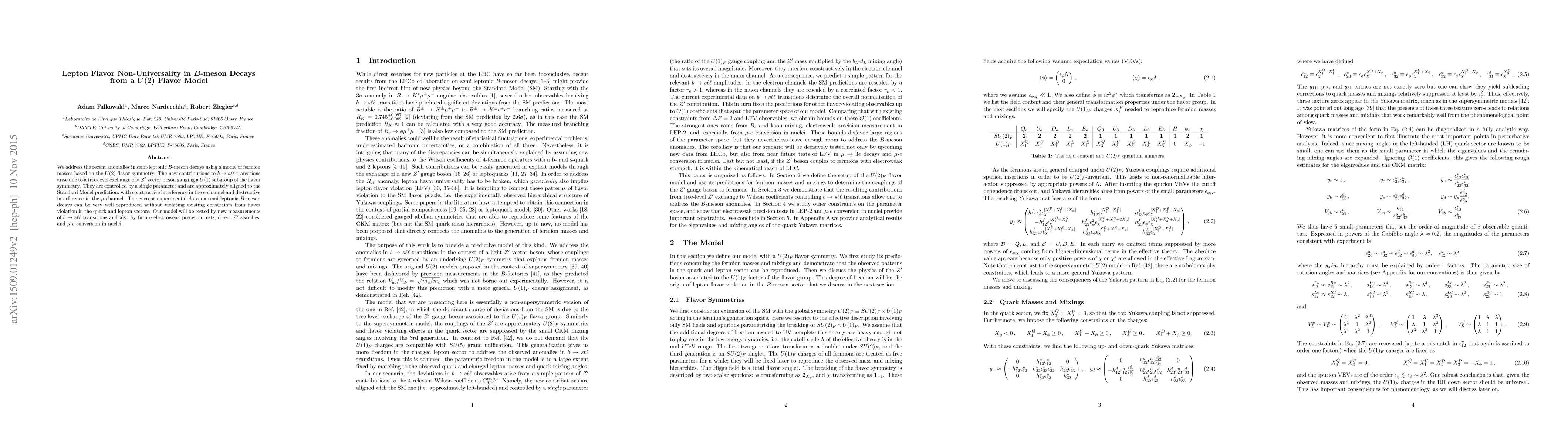We address the recent anomalies in semi-leptonic $B$-meson decays using a model of fermion masses based on the $U(2)$ flavor symmetry. The new contributions to $b \to s \ell \ell$ transitions arise due to a tree-level exchange of a $Z^\prime$ vector boson gauging a $U(1)$ subgroup of the flavor symmetry. They are controlled by a single parameter and are approximately aligned to the Standard Model prediction, with constructive interference in the $e$-channel and destructive interference in the $\mu$-channel. The current experimental data on semi-leptonic $B$-meson decays can be very well reproduced without violating existing constraints from flavor violation in the quark and lepton sectors. Our model will be tested by new measurements of $b \to s \ell \ell$ transitions and also by future electroweak precision tests, direct $Z^\prime$ searches, and $\mu$-$e$ conversion in nuclei.