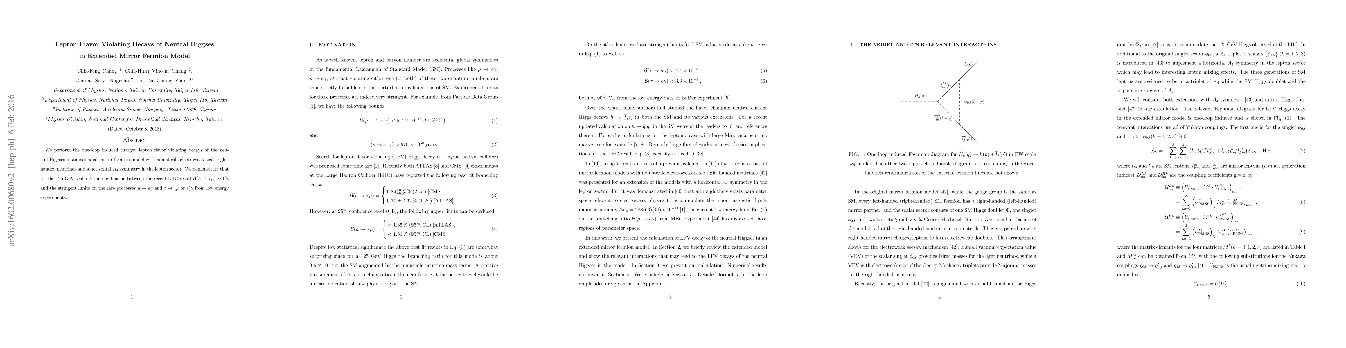 This paper investigates one-loop induced lepton flavor violating decays of neutral Higgses in an extended mirror fermion model, revealing a tension between the observed LHC decay rate of $h \to \tau \mu$ and stringent limits from low-energy experiments on processes like $\mu \to e \gamma$. The model incorporates non-sterile right-handed neutrinos and a horizontal $A_4$ symmetry.