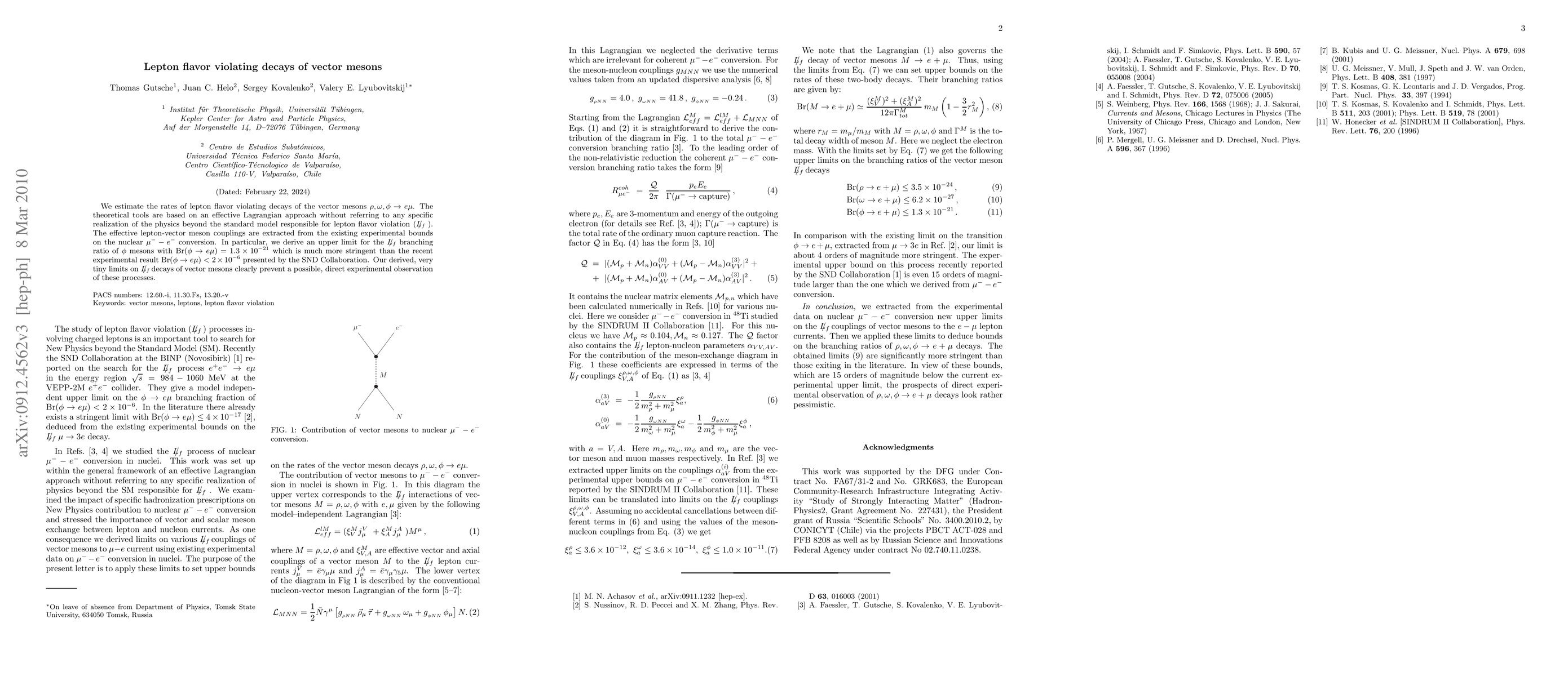 We estimate the rates of lepton flavor violating decays of the vector mesons $\rho, \omega, \phi \to e \mu$. The theoretical tools are based on an effective Lagrangian approach without referring to any specific realization of the physics beyond the standard model responsible for lepton flavor violation (\Lfv). The effective lepton-vector meson couplings are extracted from the existing experimental bounds on the nuclear $\mu^--e^-$ conversion. In particular, we derive an upper limit for the \Lfv branching ratio ${\rm Br}(\phi \to e \mu) \leq1.3 \times 10^{-21}$ which is much more stringent than the recent experimental result ${\rm Br}(\phi \to e \mu) < 2 \times 10^{-6}$ presented by the SND Collaboration. Very tiny limits on \Lfv decays of vector mesons derived in this letter make direct experimental observation of these processes unrealistic.