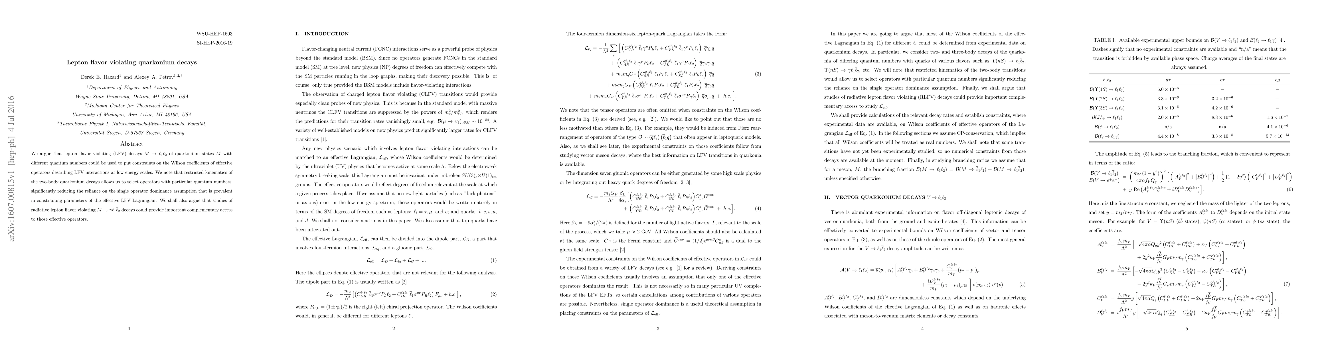 This research is significant as it offers a new approach to constrain parameters of the effective LFV Lagrangian using quarkonium decays, providing complementary information to tau and muon decays.