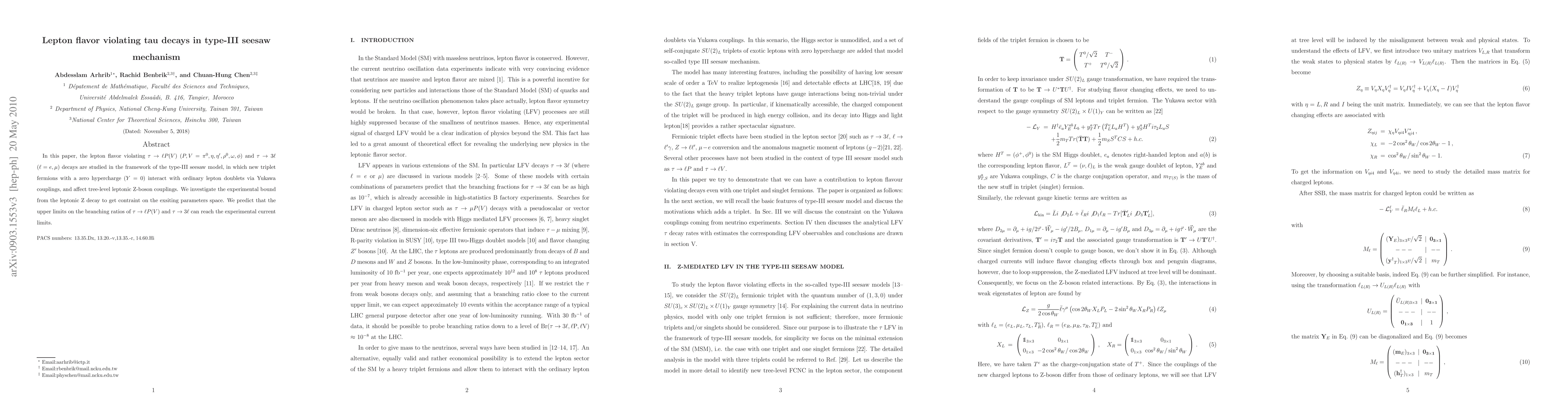 Researchers studied lepton flavor violating tau decays in a type-III seesaw mechanism, predicting upper limits on branching ratios that can reach current experimental limits.
